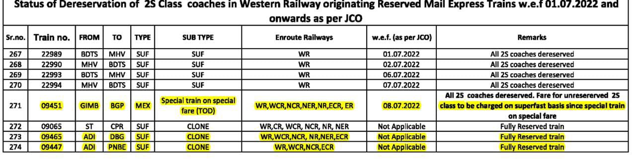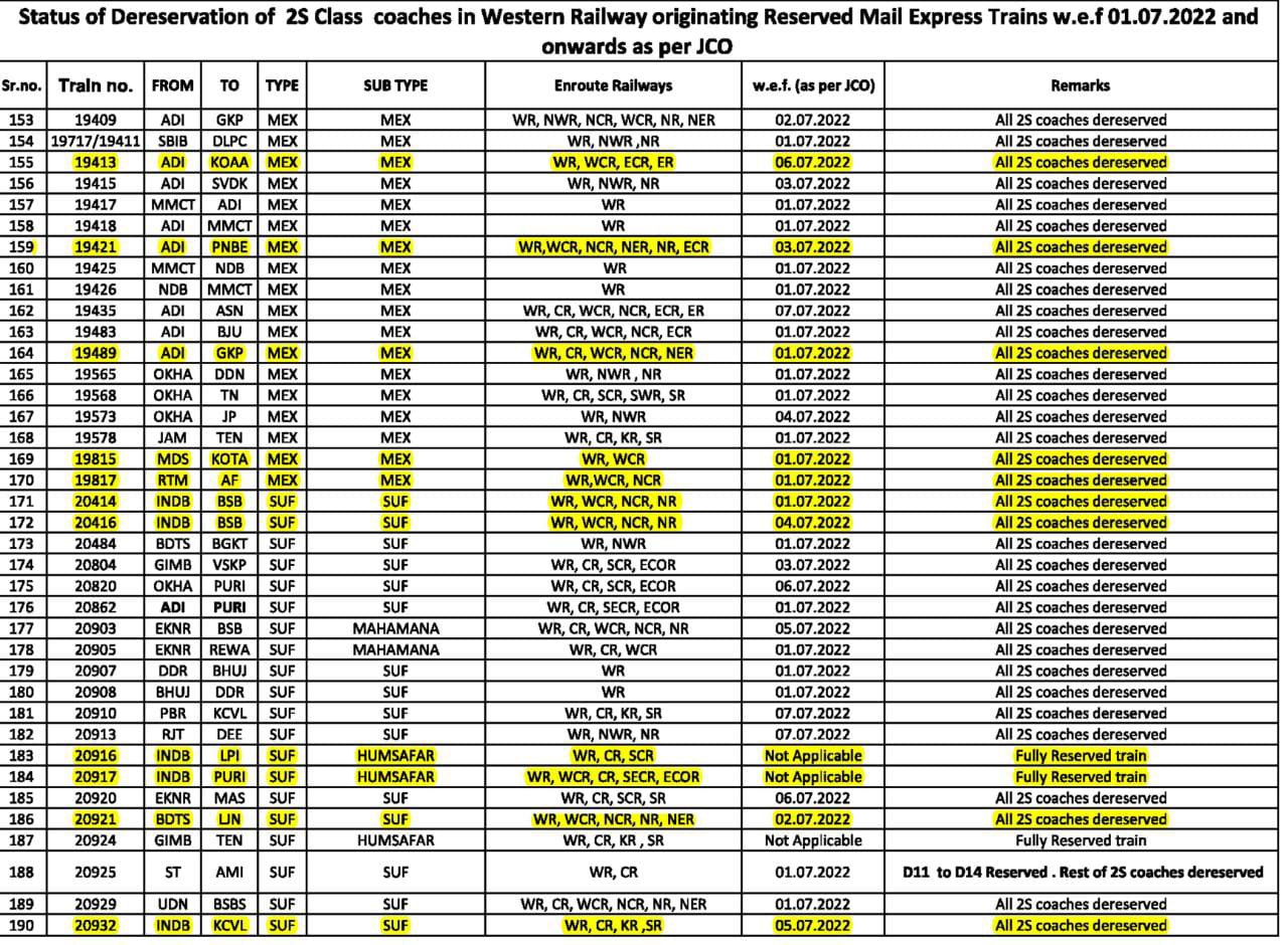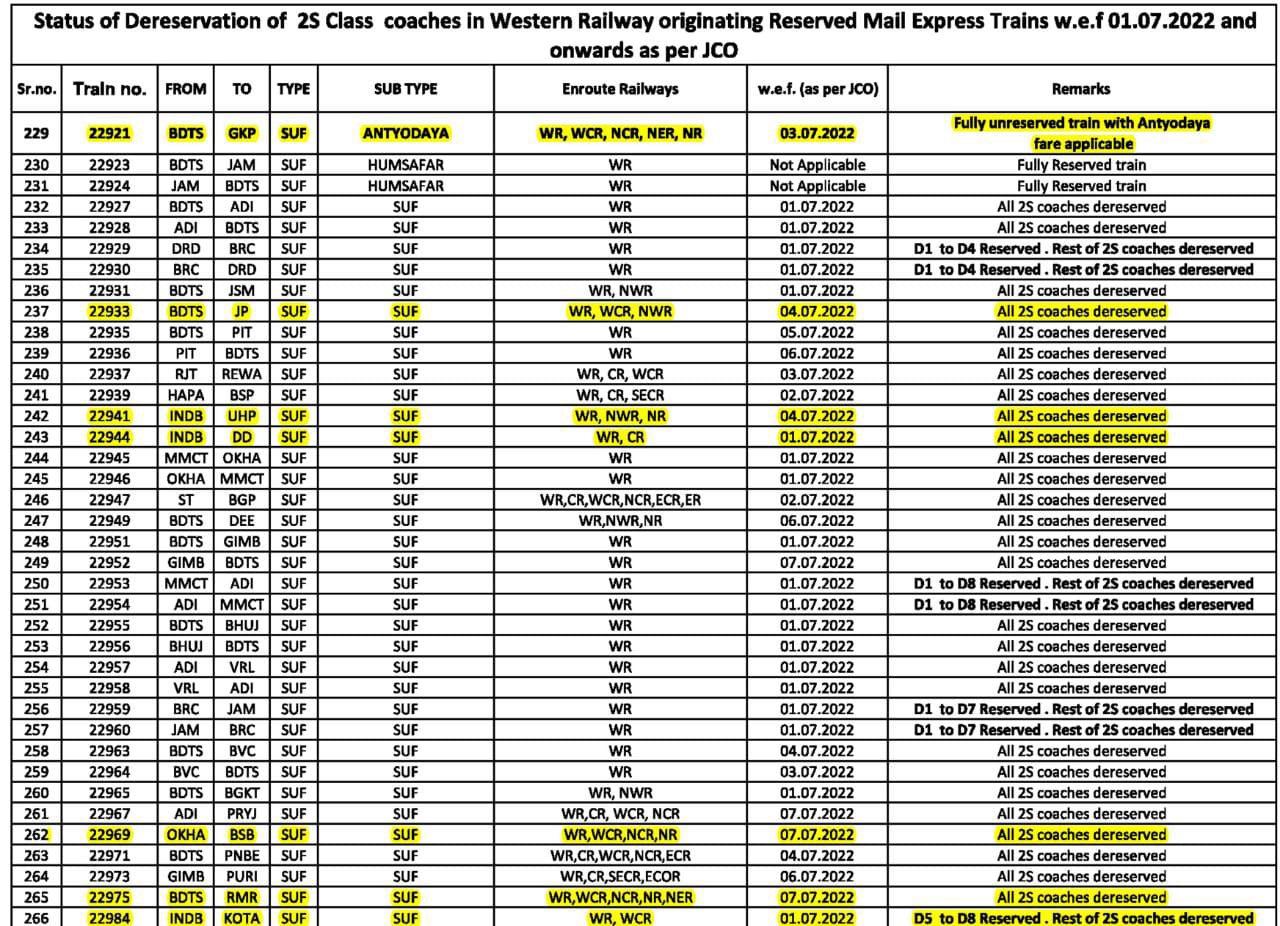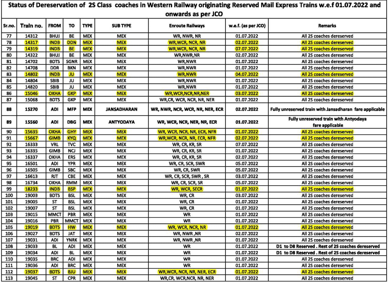 यह कुल 274 गाड़ियोंकी ऐसी सूची है, सभी गाड़ियाँ पश्चिम रेल क्षेत्र से गुजरती है। इसमें राजधानी, शताब्दी, दूरन्तो, हमसफ़र, तेजस, युवा, डबल डेकर और क्लोन गाड़ियाँ भी शामिल है जो सम्पुर्ण आरक्षित, वातानुकूलित गाडीयाँ है या ऐसी गाड़ियाँ जिनमे द्वितीय श्रेणी उपलब्ध ही नही है, अर्थात सूची में उन्हें ”नॉट ऐप्लिकेबल” ऐसा मार्क किया गया है। यात्री गण यह समझ लें जो जो गाड़ियाँ नॉन ऐप्लिकेबल मार्क है उन में आपको अनारक्षित टिकटें नही मिलेंगी। सूची में 22903/04 बान्द्रा टर्मिनस भुज बान्द्रा टर्मिनस वातानुकूलित एक्सप्रेस भी है जिसमे द्वितीय श्रेणी अनारक्षित उपलब्ध नही है।