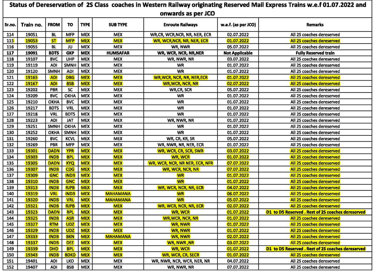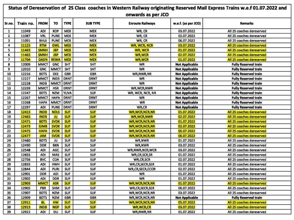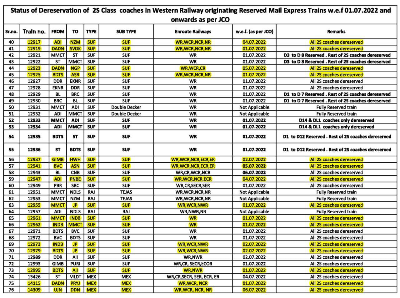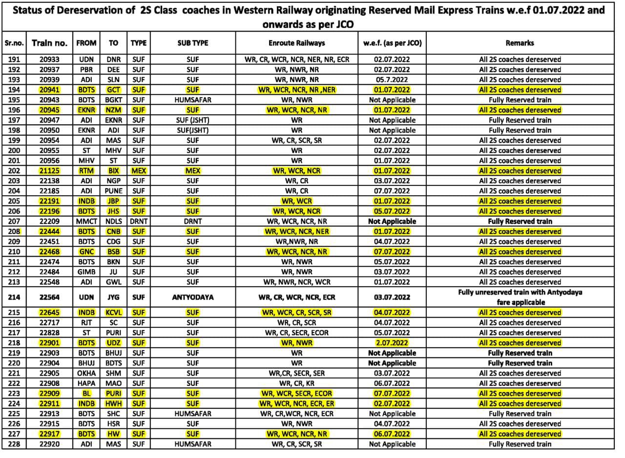 यह कुल 274 गाड़ियोंकी ऐसी सूची है, सभी गाड़ियाँ पश्चिम रेल क्षेत्र से गुजरती है। इसमें राजधानी, शताब्दी, दूरन्तो, हमसफ़र, तेजस, युवा, डबल डेकर और क्लोन गाड़ियाँ भी शामिल है जो सम्पुर्ण आरक्षित, वातानुकूलित गाडीयाँ है या ऐसी गाड़ियाँ जिनमे द्वितीय श्रेणी उपलब्ध ही नही है, अर्थात सूची में उन्हें ”नॉट ऐप्लिकेबल” ऐसा मार्क किया गया है। यात्री गण यह समझ लें जो जो गाड़ियाँ नॉन ऐप्लिकेबल मार्क है उन में आपको अनारक्षित टिकटें नही मिलेंगी। सूची में 22903/04 बान्द्रा टर्मिनस भुज बान्द्रा टर्मिनस वातानुकूलित एक्सप्रेस भी है जिसमे द्वितीय श्रेणी अनारक्षित उपलब्ध नही है।