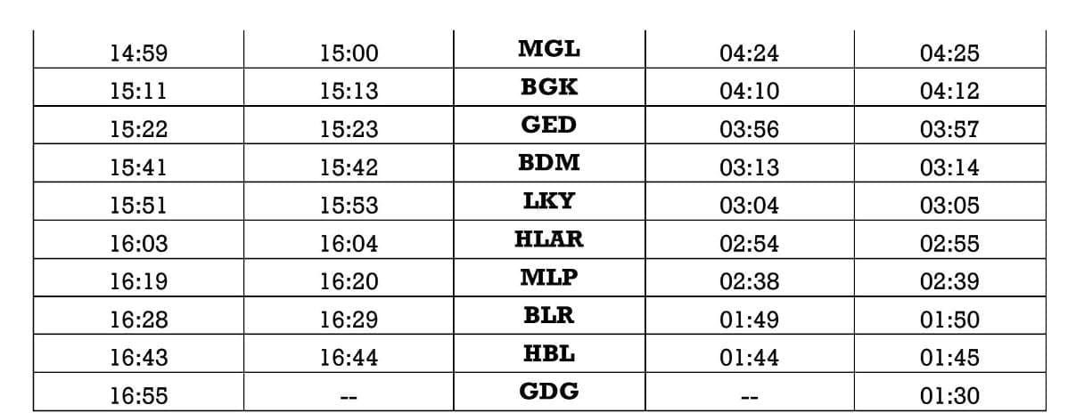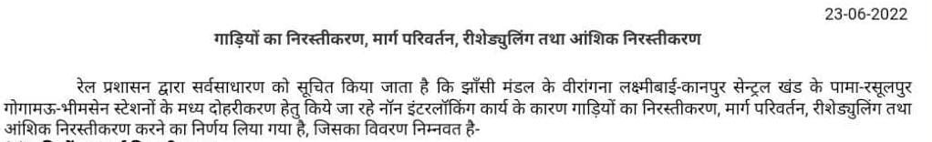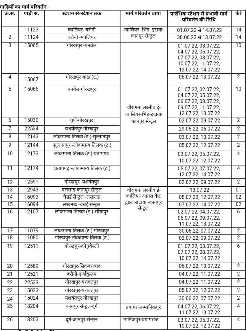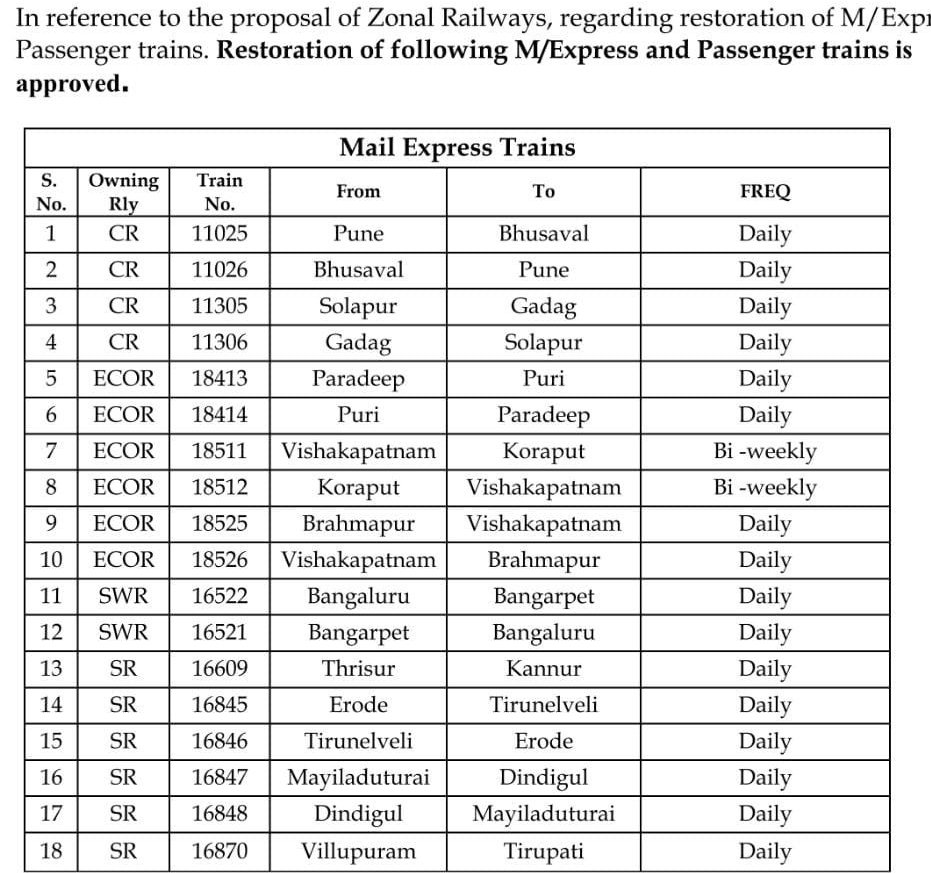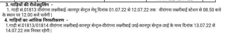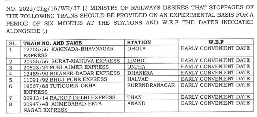 रेल प्रशासन ने आठ स्टेशनोंपर आठ जोड़ी गाड़ियोंके ठहरावों को छह महीनोंके लिए प्रायोगिक तौर पर मान्यता दी है। परिपत्रक कहा गया है, मण्डल अपने सुविधा अनुसार इसे लागू कर सकता है। चूंकि सम्बन्धित मण्डलों ने इन सारे स्टोपेजेस को अभी जारी नही किया है अतः हमारे पास इस वक्त इनकी समय सारणी उपलब्ध नही है।