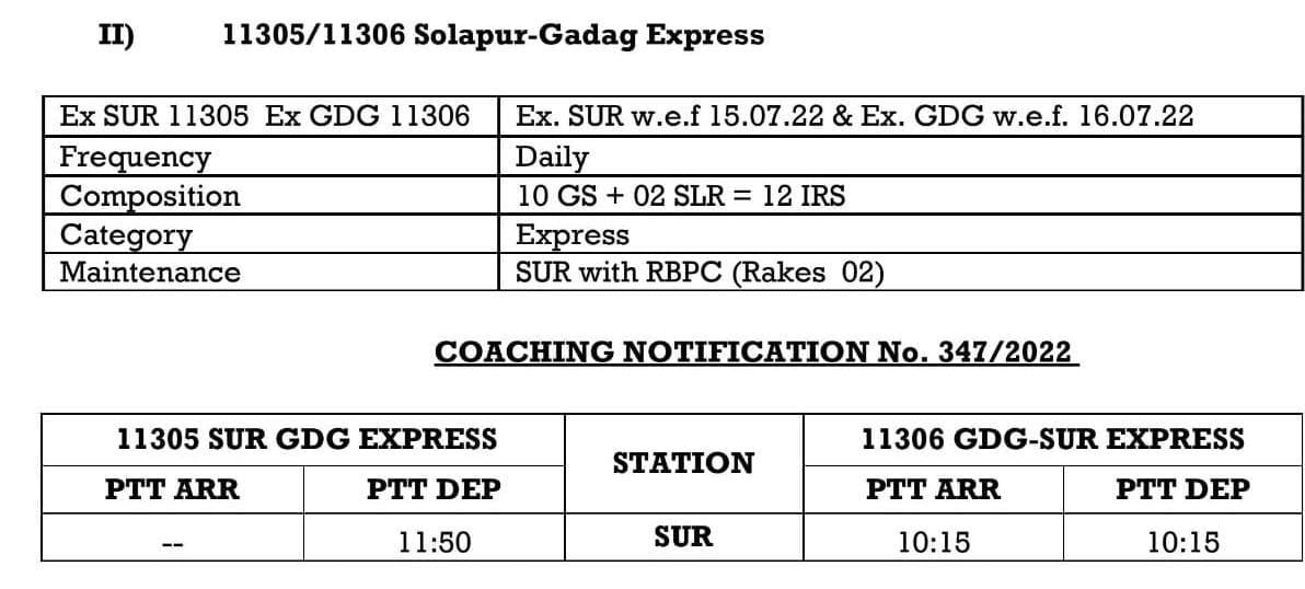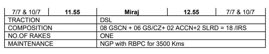 01115 नागपुर मिरज विशेष दिनांक 6 आणि 9 जुलै ला नागपुर हुन सकाळी 8:50 ला सूटेल आणि पुढल्या दिवशी म्हणजे दिनांक 7 आणि 10 जुलै ला सकाळी 11:55 ला मिरजे ला पोहोचेल. परतीच्या प्रवासात 01116 मिरज नागपुर विशेष दिनांक 7 आणि 10 जुलै ला दुपारी 12:55 ला मिरजे हुन निघेल आणि दुसऱ्या दिवशी अर्थात दिनांक 8 आणि 11 जुलै ला नागपुरला दुपारी 12:25 पोहोचेल. सर्वसाधारण मेल/एक्सप्रेस चे सर्व थाम्बे ह्या गाड्या घेतील. डबे :- 8 द्वितीय श्रेणी स्लीपर, 6 द्वितीय श्रेणी सिटिंग / चेयर कार, 2 वातानुकूलित थ्री टियर आणि 2 एसएलआर एकूण 18