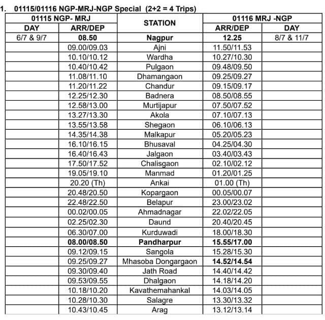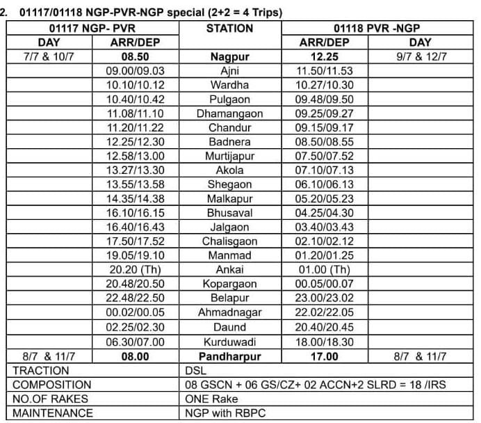 01117 नागपुर पंढरपुर विशेष दिनांक 7 आणि 10 जुलै ला नागपुर हुन सकाळी 8:50 ला सूटेल आणि पुढल्या दिवशी म्हणजे दिनांक 8 आणि 11 जुलै ला सकाळी 8:00 ला पंढरपुरला पोहोचेल. परतीच्या प्रवासात 01118 पंढरपुर नागपुर विशेष दिनांक 8 आणि 11 जुलै ला संध्याकाळी 17:00 ला पंढरपुरहुन निघेल आणि दुसऱ्या दिवशी अर्थात दिनांक 9 आणि 12 जुलै ला नागपुर ला दुपारी 12:25 ला पोहोचेल. सर्वसाधारण मेल/एक्सप्रेस चे सर्व थाम्बे ह्या गाड्या घेतील. डबे :- 8 द्वितीय श्रेणी स्लीपर, 6 द्वितीय श्रेणी सिटिंग / चेयर कार, 2 वातानुकूलित थ्री टियर आणि 2 एसएलआर एकूण 18