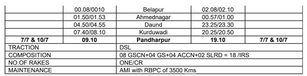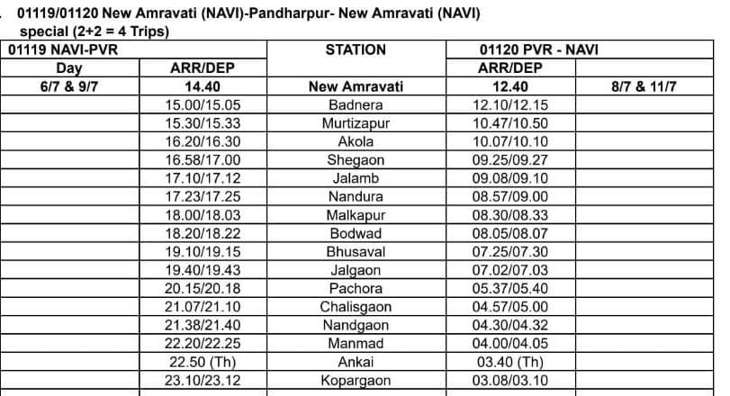 01119 नवी अमरावती पंढरपुर विशेष दिनांक 6 आणि 9 जुलै ला नवी अमरावतीहुन दुपारी 14:40 ला सूटेल आणि पुढल्या दिवशी म्हणजे दिनांक 7 आणि 10 जुलै ला सकाळी 9:10 ला पंढरपुरला पोहोचेल. परतीच्या प्रवासात 01120 पंढरपुर नवी अमरावती विशेष दिनांक 7 आणि 10 जुलै ला संध्याकाळी 19:10 ला पंढरपुरहुन निघेल आणि दुसऱ्या दिवशी अर्थात दिनांक 8 आणि 11 जुलै ला नवी अमरावतीला दुपारी 12:40 ला पोहोचेल. सर्वसाधारण मेल/एक्सप्रेस चे सर्व थाम्बे ह्या गाड्या घेतील. डबे :- 8 द्वितीय श्रेणी स्लीपर, 4 द्वितीय श्रेणी सिटिंग / चेयर कार, 4 वातानुकूलित थ्री टियर आणि 2 एसएलआर एकूण 18
