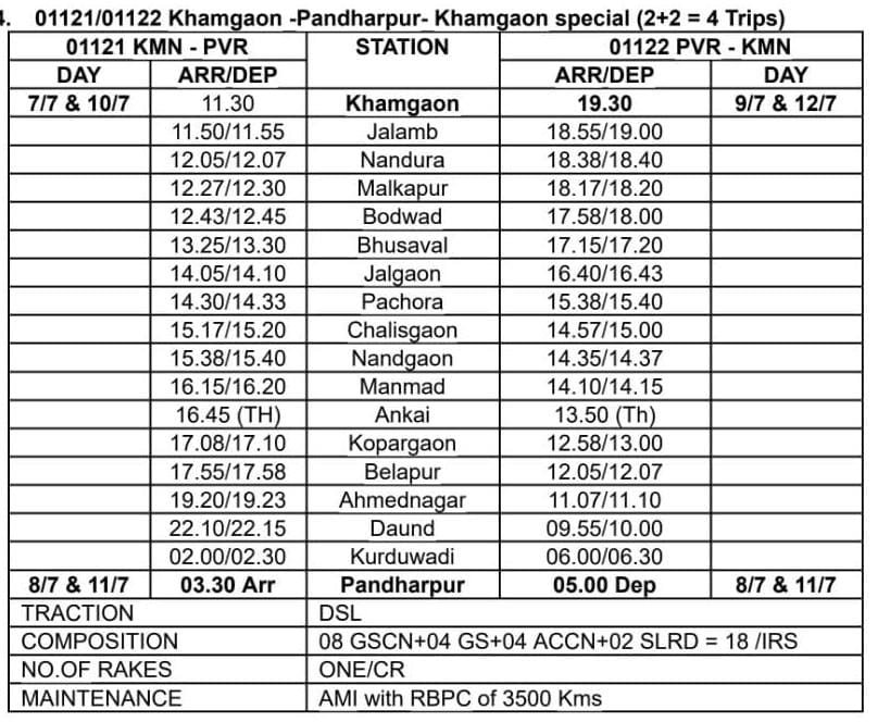 01121 खामगांव पंढरपुर विशेष दिनांक 7 आणि 10 जुलैला खामगांव हुन सकाळी 11:30 ला सूटेल आणि पुढल्या दिवशी म्हणजे दिनांक 8 आणि 11 जुलै ला पहाटे 3:30 ला पंढरपुरला पोहोचेल. परतीच्या प्रवासात 01122 पंढरपुर खामगांव विशेष दिनांक 8 आणि 11 जुलै ला सकाळी 5:00 ला पंढरपुरहुन निघेल आणि दुसऱ्या दिवशी अर्थात दिनांक 9 आणि 12 जुलै ला खामगांव ला संध्याकाळी 19:30 ला पोहोचेल. सर्वसाधारण मेल/एक्सप्रेस चे सर्व थाम्बे ह्या गाड्या घेतील. डबे :- 8 द्वितीय श्रेणी स्लीपर, 6 द्वितीय श्रेणी सिटिंग / चेयर कार, 2 वातानुकूलित थ्री टियर आणि 2 एसएलआर एकूण 18