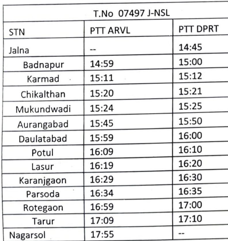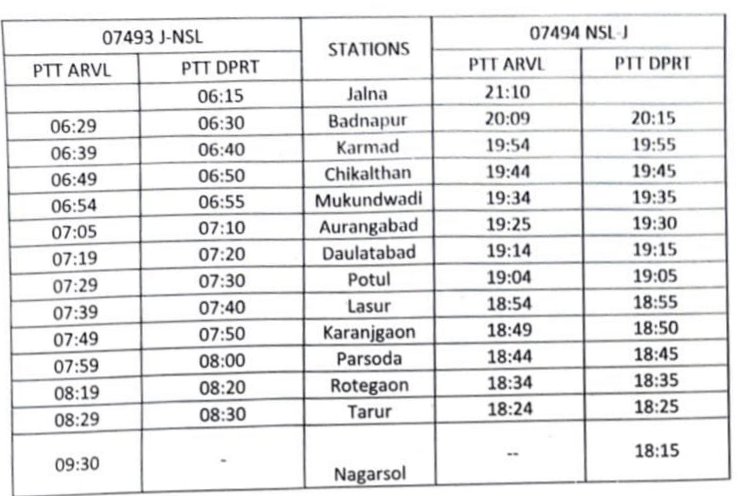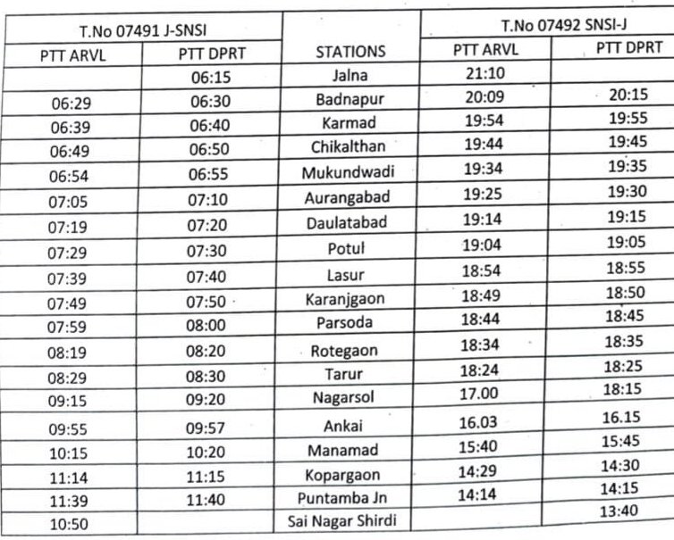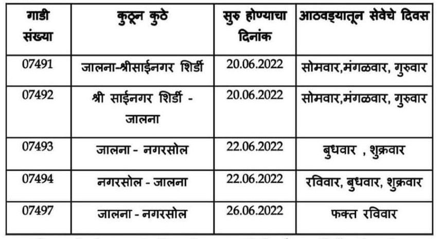 07491/92 जालना साई नगर शिर्डी जालना यह विशेष अनारक्षित गाड़ी दिनांक 20 जून से दोनोंही दिशासे प्रत्येक सोमवार, मंगलवार एवं गुरुवार को चलेगी।