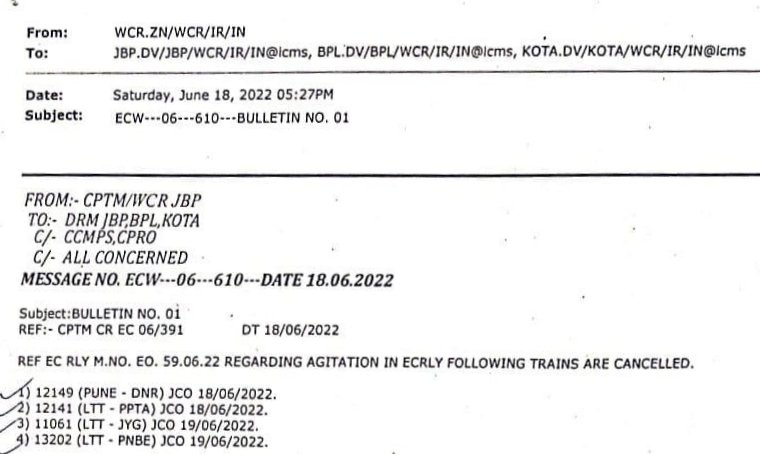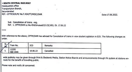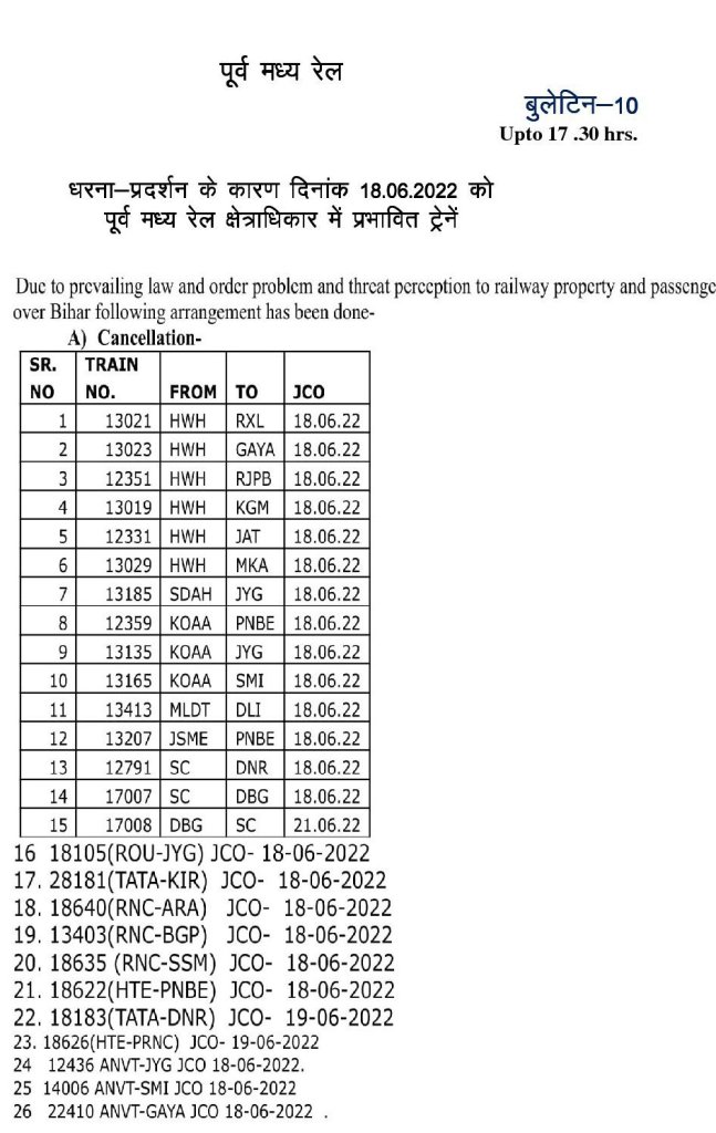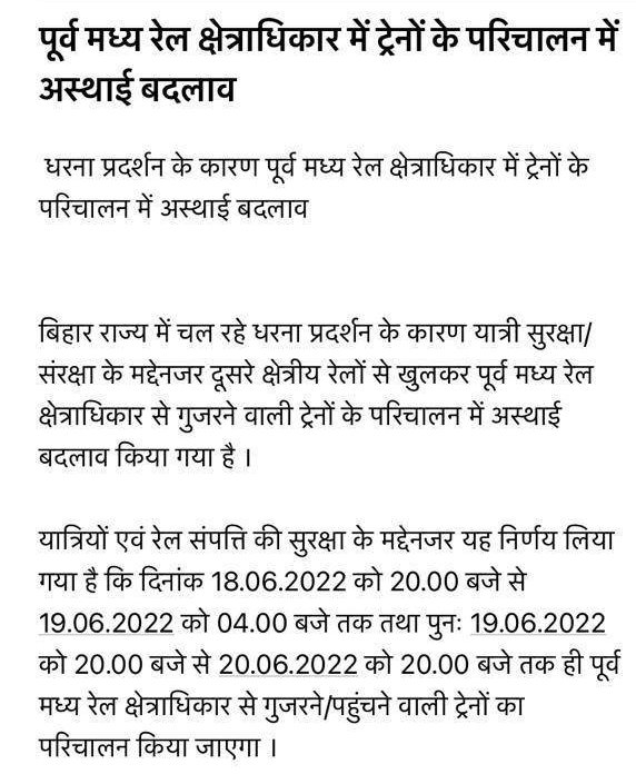 यात्रीगण से निवेदन है, बिहार, तेलंगाना में उक्त विरोध का रेल यातायात पर गहरा असर पड़ा है। कृपया रेलवे हेल्पलाइन 139 पर पूछताछ कर अपनी रेल यात्रा का नियोजन करें।