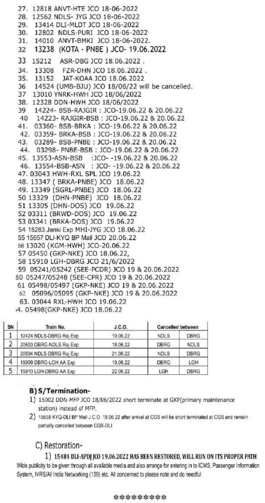 इन्ही आंदोलन के चलते आज सैकड़ों गाड़ियाँ रद्द, आँशिक रद्द या मार्ग बदल कर चलानी पड़ रही है। हमने कल भी यात्रिओंसे निवेदन किया था और आने वाले कुछ दिनोंतक कह रहे है, अपनी रेल यात्रा का नियोजन रेल हेल्पलाइन 139 की सहायता लेकर करें। गाड़ियाँ रद्द किए जाने के कारण नियमित गाड़ियोंका परिचालन अस्ताव्यस्त होता है और उनका रैक शेयरिंग भी गड़बड़ा जाता है।