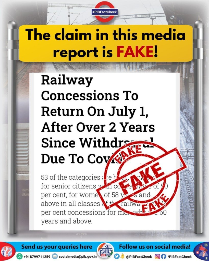 एक फर्जी मीडिया रिपोर्ट में दावा किया जा रहा है की भारतीय रेलवे 1 जुलाई, 2022 से वरिष्ठ नागरिकों के लिए रियायतें फिर से शुरू करेगा।