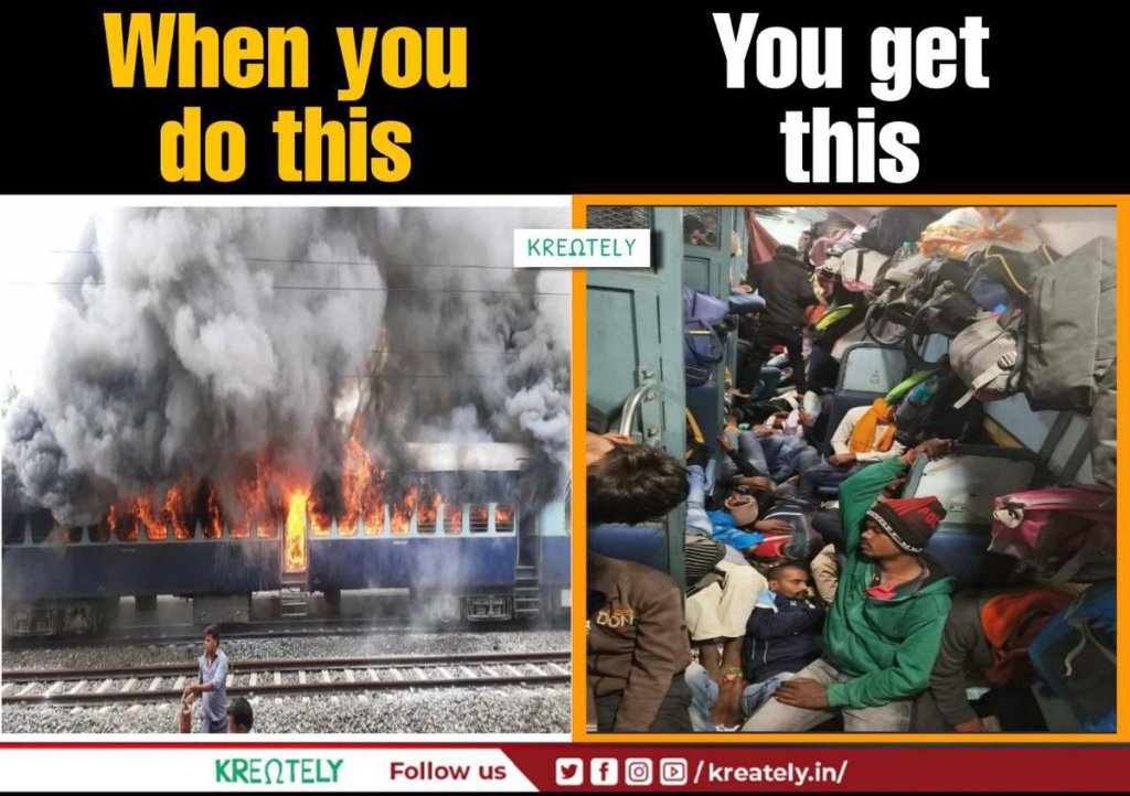 जिन संक्रमण काल मे रेल कर्मियोंने अपने जान हथेली पर रख देशवासियों के राशन की आपूर्ति की, उन्हें अपने घरोंतक पहुंचाया, आज उन सारी बातोंको भुलाकर देश के कई भागोंमें आंदोलनकारियोंने रेल गाड़ियाँ फूँकी है, रेलवे स्टेशनोंपर लूटपाट मचाई है। इतना ही नही रेल यात्रिओंके जान माल की तक इन आन्दोलनकारियोंने परवाह नही की। कल और आज रेल गाड़ियोंके जलते डिब्बे, आँसू बहाते, अपने जान को बचाने इधर उधर भागते यात्रिओंको देखकर मन व्यथित हो जाता है। रेल आपकी अपनी सम्पत्ति है, कोई भला कैसे अपने ही घरोंमें आग लगा सकता है?