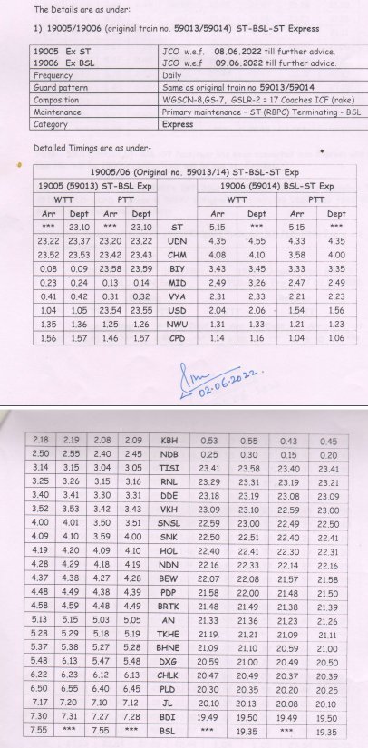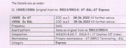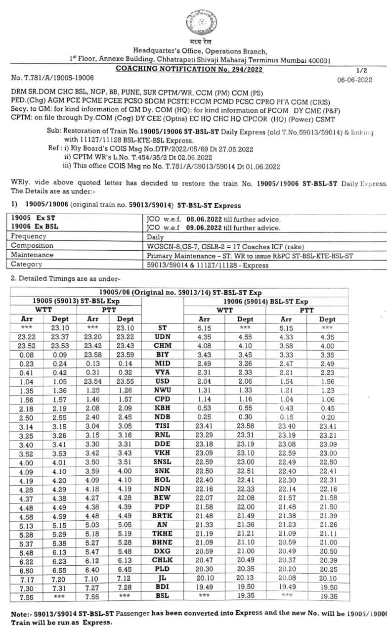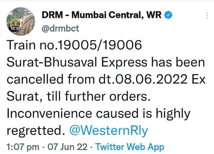 मित्रों, कल परसों की बात है। हमने आपके साथ पश्चिम रेल का एक परिपत्रक साँझा किया था। बड़ी खुशखबर थी, 59013/14 सूरत भुसावल सूरत सवारी गाड़ी के 19005/06 एक्सप्रेस रूप में पुनर्स्थापित होने की, मगर आज परे के मुम्बई मण्डल व्यवस्थापक DRM की ओर से उस गाड़ी की अनिश्चित काल स्थगित करने की सूचना ट्विटर पर जारी हो गयी।