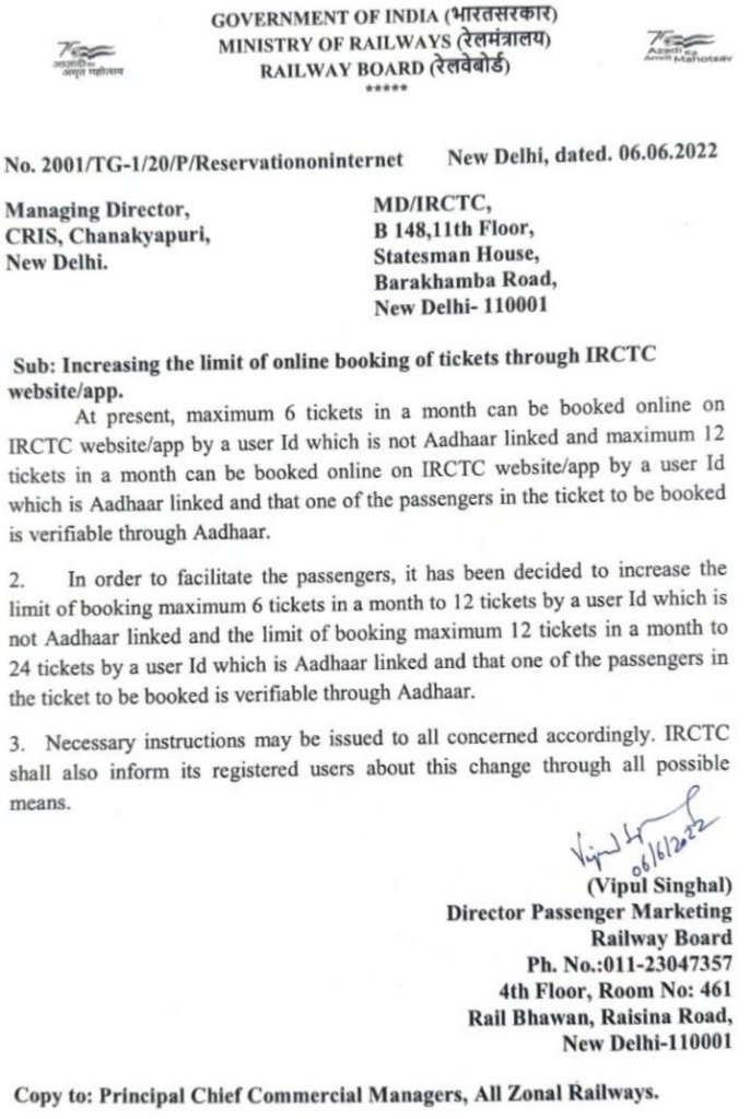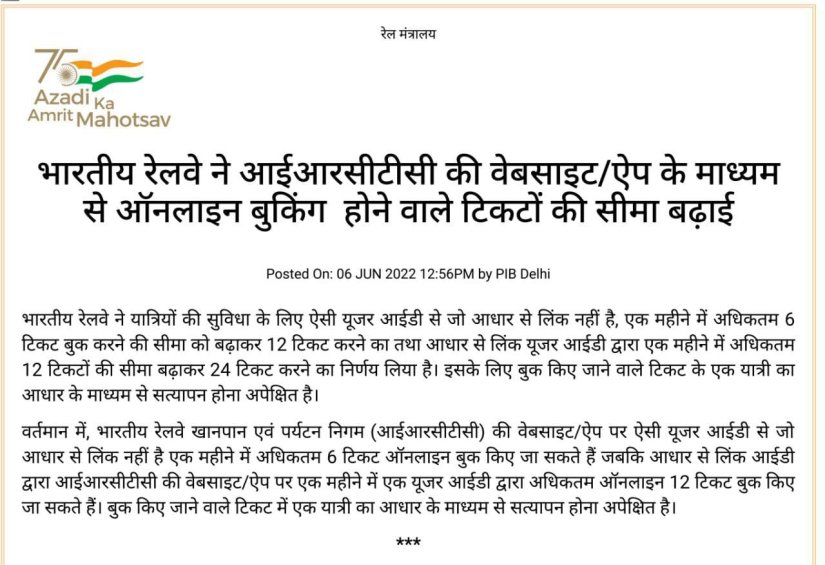 भारतीय रेल की ई-टिकट बुकिंग कम्पनी, IRCTC के वेबसाइट और ऐप पर जो टिकट बुकिंग पर किसी एक यूजर आई डी पर 6 टिकट प्रति माह की मर्यादा थी उसमें ढील देने का निर्णय रेल प्रशासन ने लिया है। यह टिकट बुकिंग की मर्यादा अब 6 की जगह 12 टिकटें प्रति माह होगी। साथ ही यदि यूजर आई डी आधार लिंक्ड हो और ई टिकट में उसी आई डी के आधार सत्यापित यात्री की हो तो ऐसी स्थिति में टिकटोंकी मर्यादा को 12 प्रति माह से बढाकर 24 टिकट प्रति माह कीया जा रहा है।