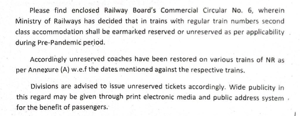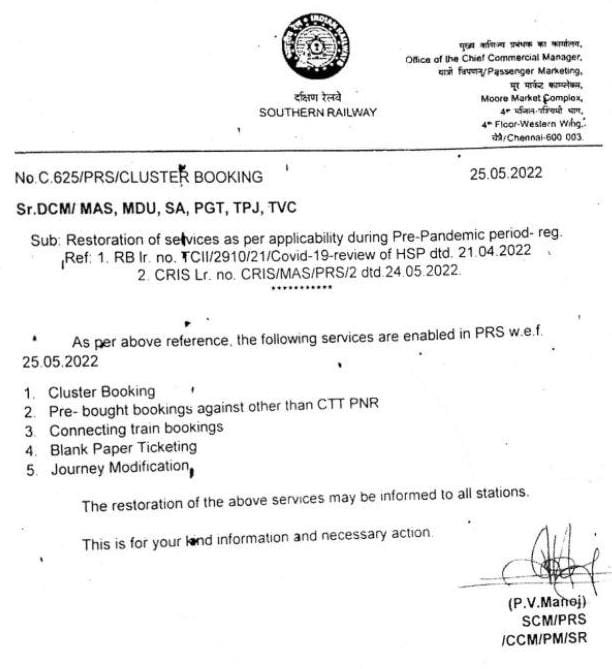 निम्नलिखित परिपत्रक देखें, रेल प्रशासन ने जो टिकिटिंग सुविधाएं संक्रमनपूर्व काल मे शुरू थी उन्हें पुनर्स्थापित करने का निर्णय लिया है।
