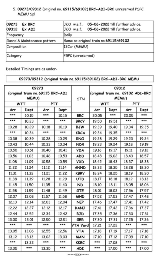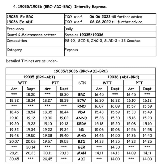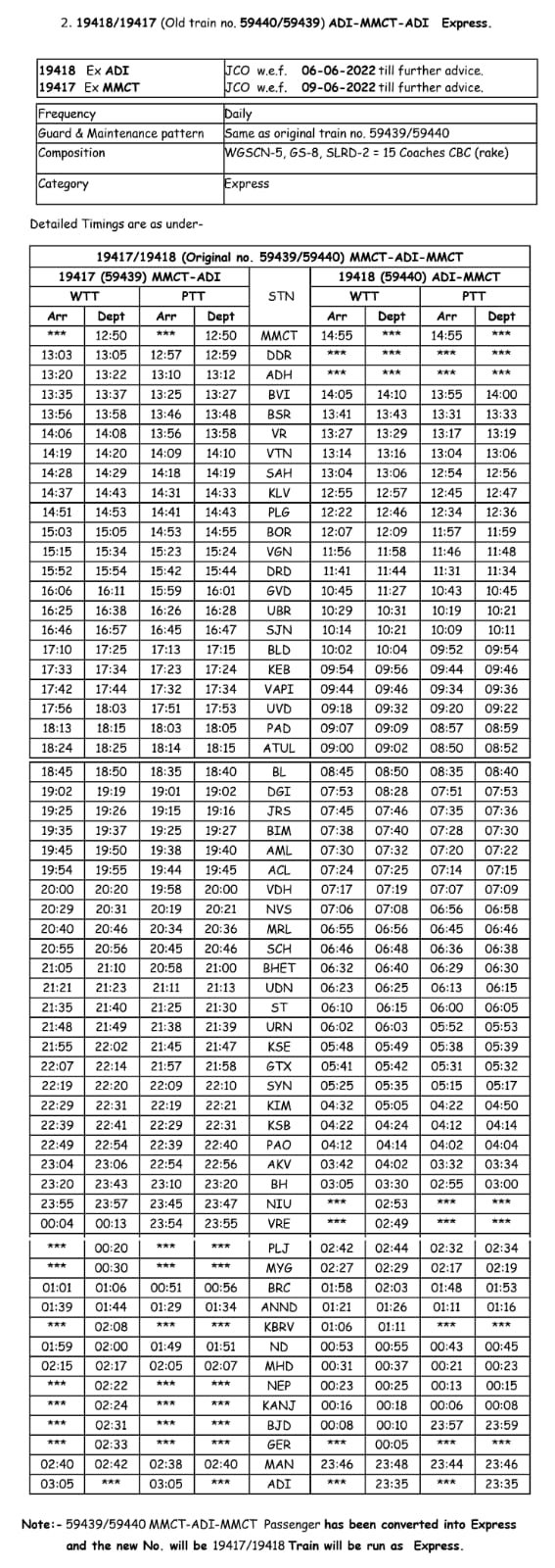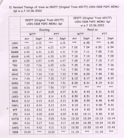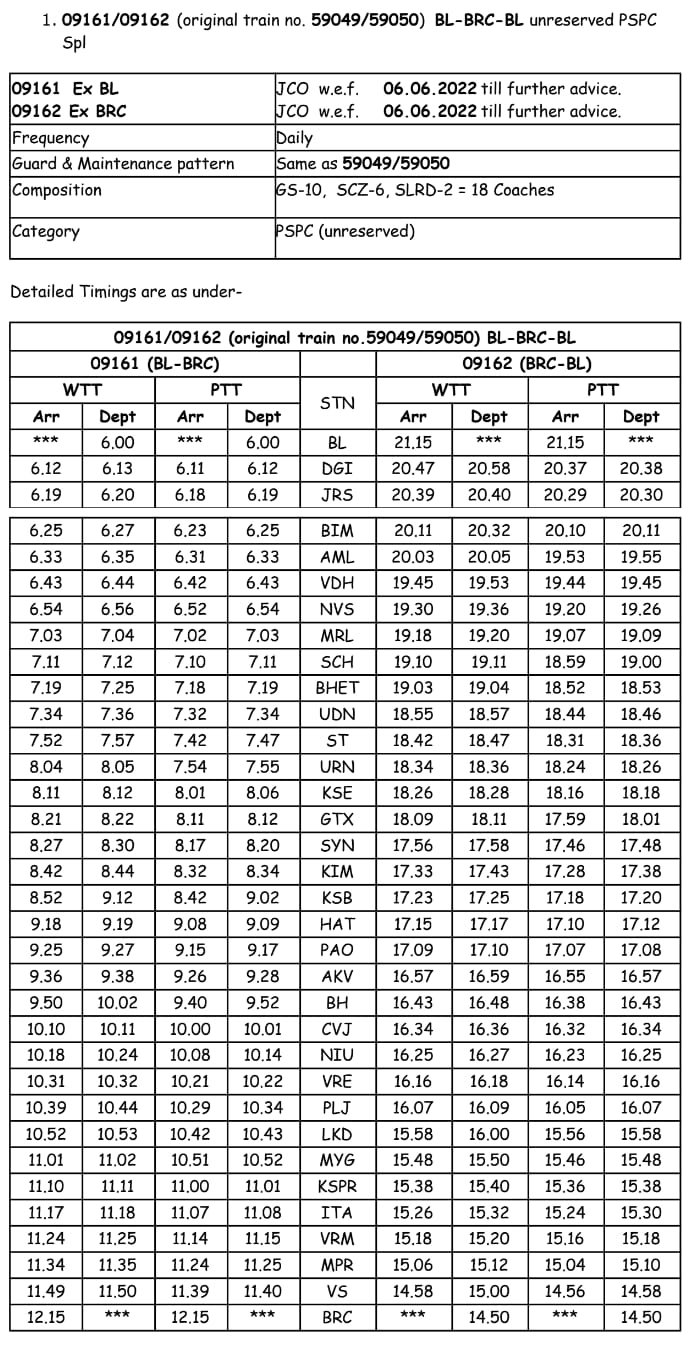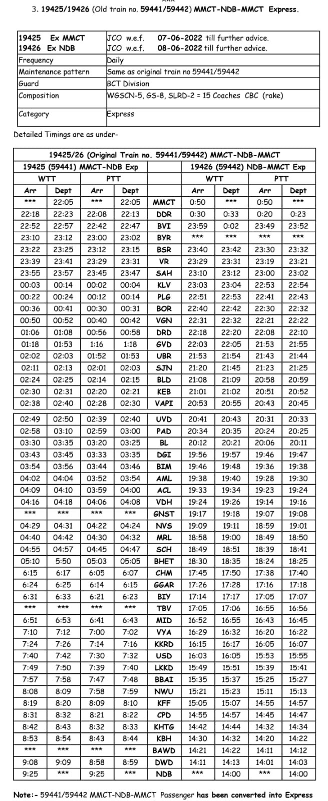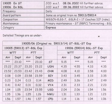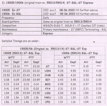 सूरत भुसावल सूरत के बीच लोकप्रिय 59013/14 सवारी गाड़ी दिनांक 08/09 जून से प्रतिदिन एक्सप्रेस रूप में 19005/06 बहुत ही आकर्षक समयसारणी में पुनर्स्थापित की जा रही है। गाड़ी में 8 द्वितीय श्रेणी शयनयान स्लीपर, 7 द्वितीय श्रेणी जनरल एव दो एसएलआर रहेंगे। यात्रीगण से निवेदन है, समयसारणी में दिए गए PTT अर्थात पब्लिक टाइमटेबल का ही उपयोग करना है। WTT वर्किंग टाइमटेबल रेल कार्यालय उपयोग के लिए होते है।