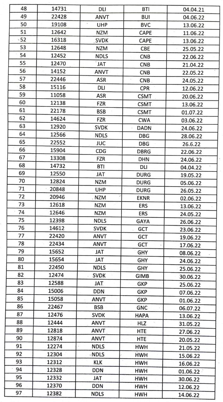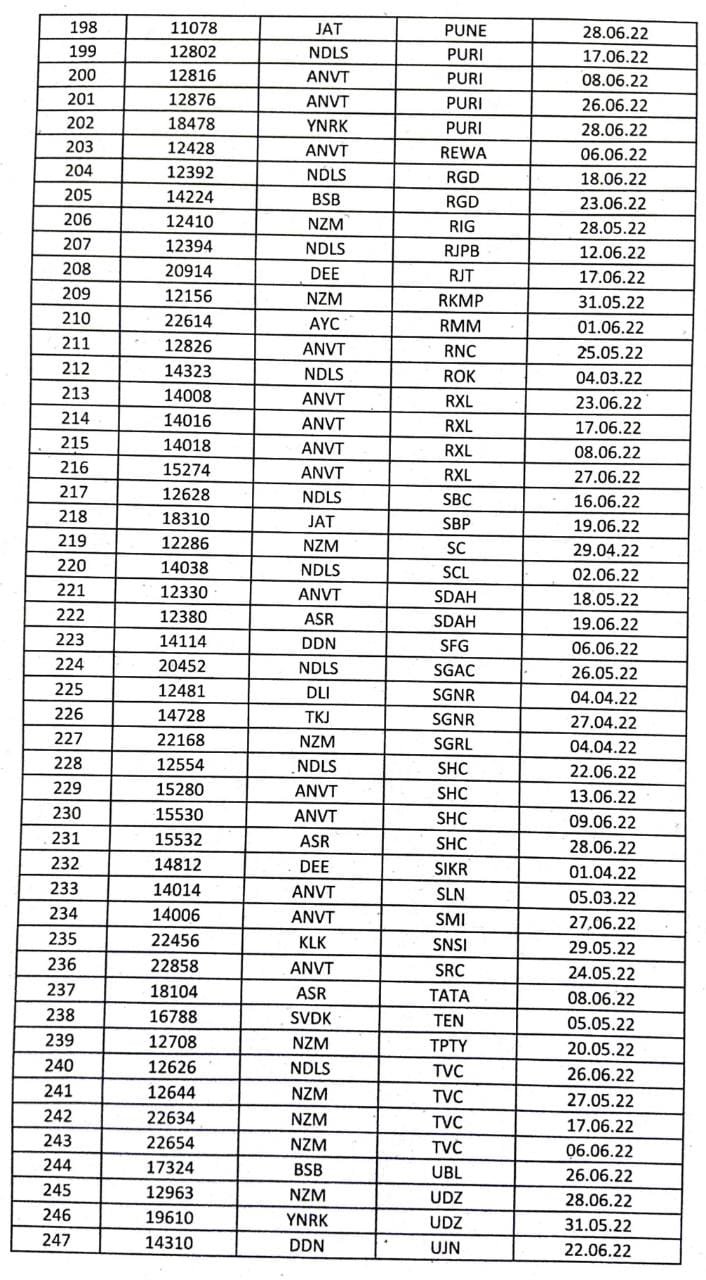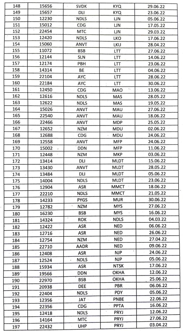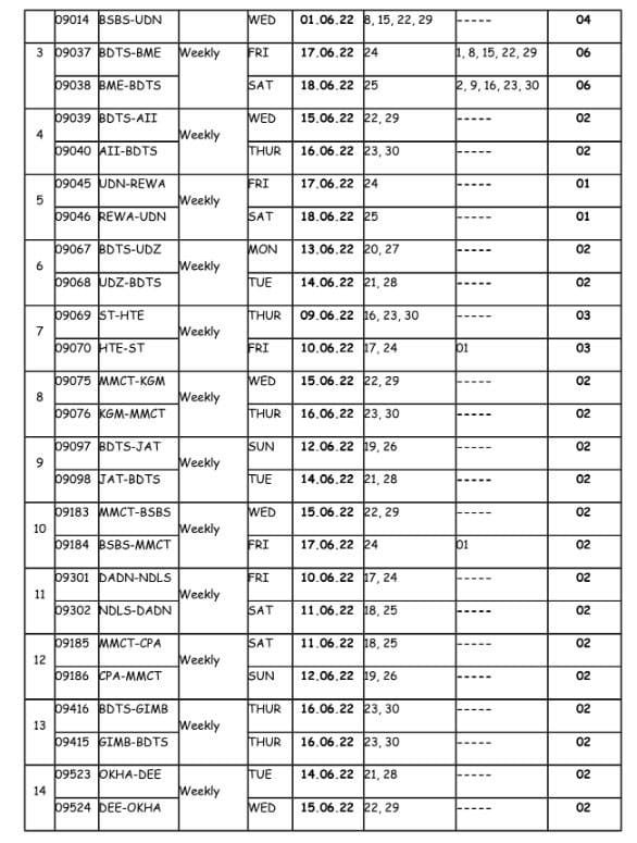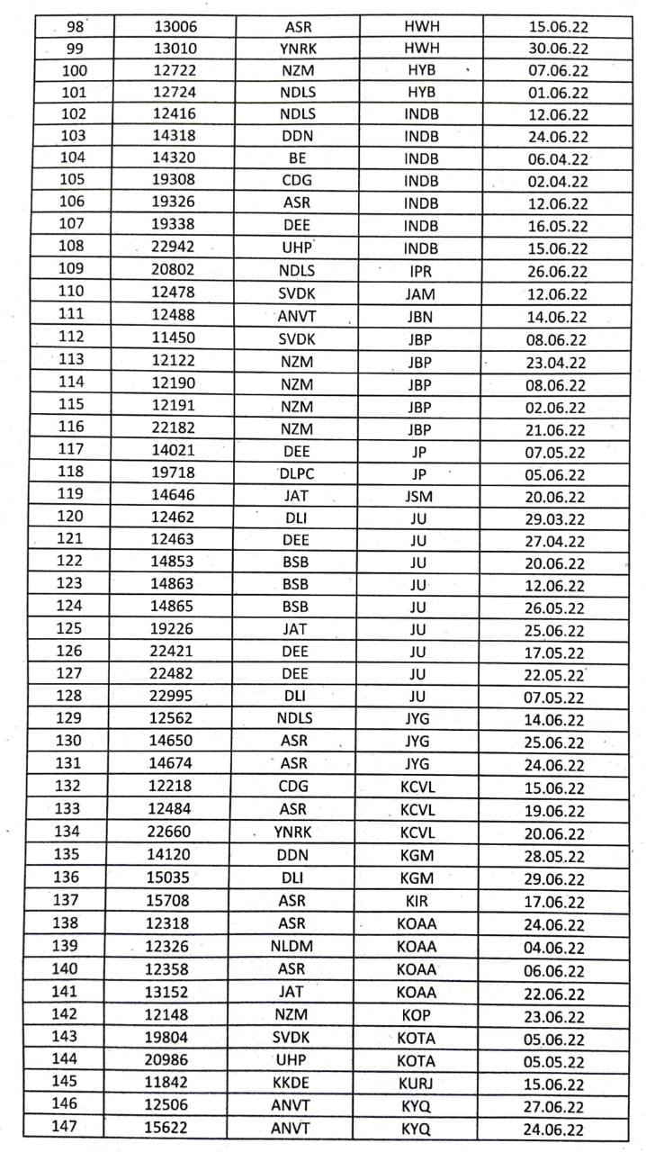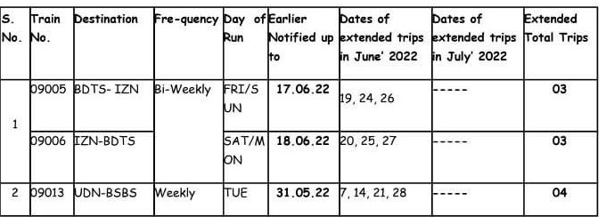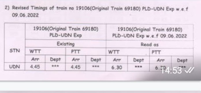 सूरत भुसावल सूरत के बीच लोकप्रिय 59013/14 सवारी गाड़ी दिनांक 08/09 जून से प्रतिदिन एक्सप्रेस रूप में 19005/06 बहुत ही आकर्षक समयसारणी में पुनर्स्थापित की जा रही है। गाड़ी में 8 द्वितीय श्रेणी शयनयान स्लीपर, 7 द्वितीय श्रेणी जनरल एव दो एसएलआर रहेंगे। यात्रीगण से निवेदन है, समयसारणी में दिए गए PTT अर्थात पब्लिक टाइमटेबल का ही उपयोग करना है। WTT वर्किंग टाइमटेबल रेल कार्यालय उपयोग के लिए होते है।