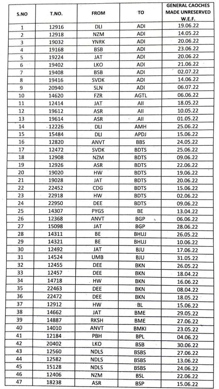 मित्रों, अनारक्षित द्वितीय श्रेणी टिकट का इंतजार काफी लम्बा खींच गया है, लेकिन बस यह महीना। लगभग जून महीने में कई गाड़ियोंमे अनारक्षित टिकिटिंग शुरू हो जाएगी। यह सूची उत्तर रेलवे क्षेत्र से गुजरने वाली गाड़ियोंकी है।