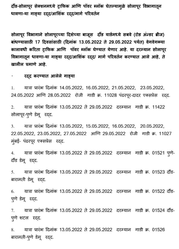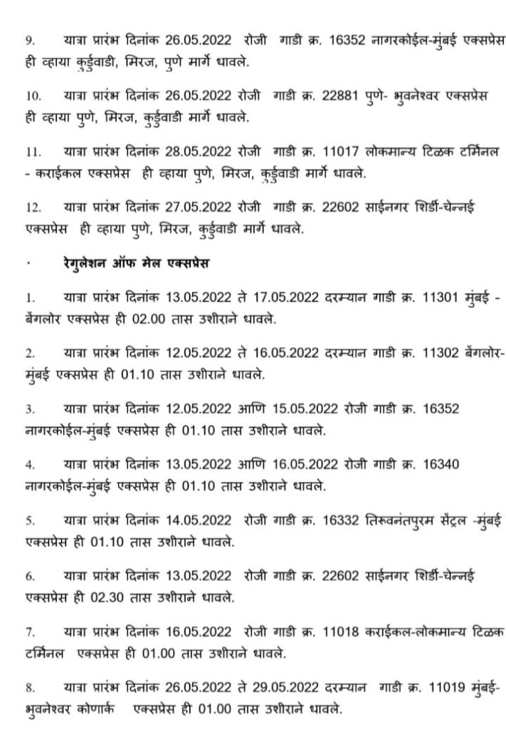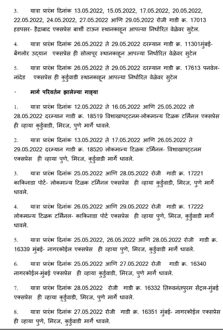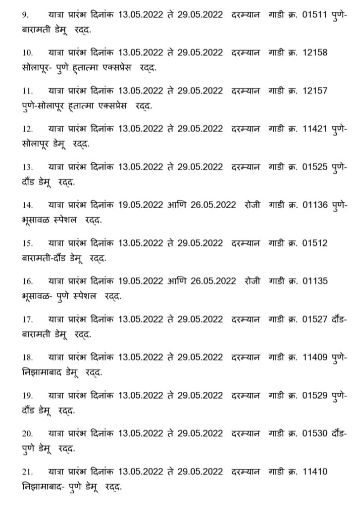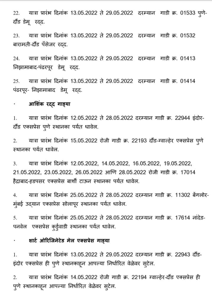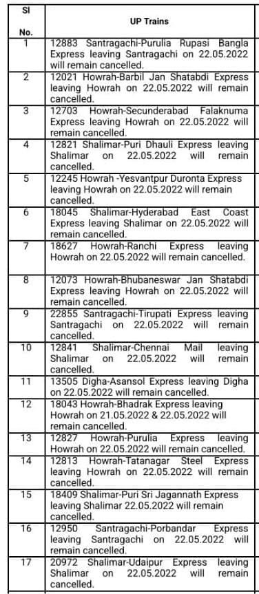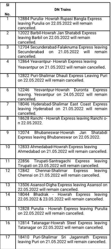 हावड़ा की ओरसे निकलने वाली (अप )पूर्णतः रदद् गाड़ियाँ : – मध्य रेल CR पर आने वाली 12950 सांतरागाछी पोरबन्दर JCO 22/5/2022 और 12834 हावड़ा अहमदाबाद एक्सप्रेस JCO 22/5/2022 अपने शूरवाती स्टेशन से पूर्ण यात्रा के लिए रद्द रहेगी। इतर गाड़ियोंकी सूची निम्नप्रकार से है,