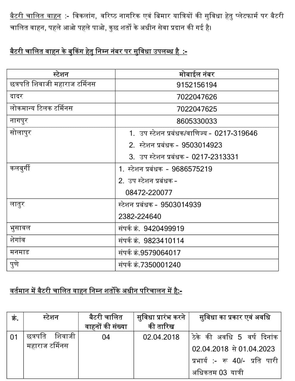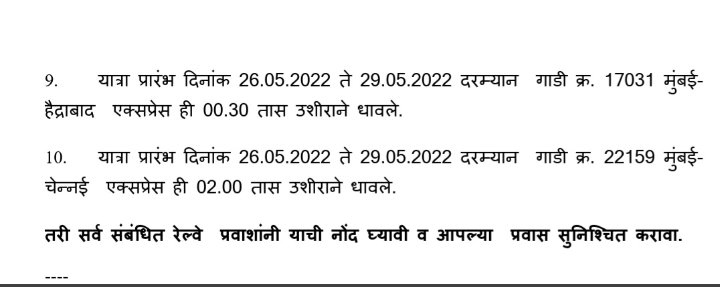 समय नियंत्रण कर चलनेवाली गाडियाँ :- 12810 हावड़ा मुम्बई मेल वाया नागपूर जो दिनांक 22 मई को हावड़ा से चलनेवाली है, अपने नियोजित समय 19:50 की जगह दो घण्टे देरी से याने 21:50 को हावड़ा से रवाना की जाएगी।