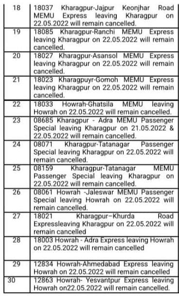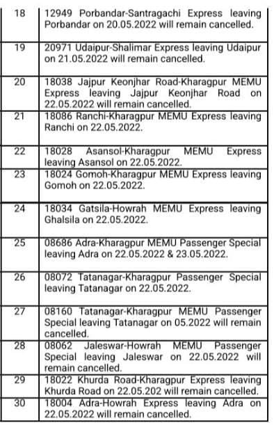 हावड़ा की ओर जानेवाली ( डाउन ) पूर्णतः रदद् गाड़ियाँ : – मध्य रेल CR पर आने वाली 12833 अहमदाबाद हावड़ा JCO 21/5/2022 और 12949 पोरबन्दर सांतरागाछी एक्सप्रेस JCO 20/5/2022 अपने शूरवाती स्टेशन से पूर्ण यात्रा के लिए रद्द रहेगी। इतर गाड़ियोंकी सूची निम्नप्रकार से है,