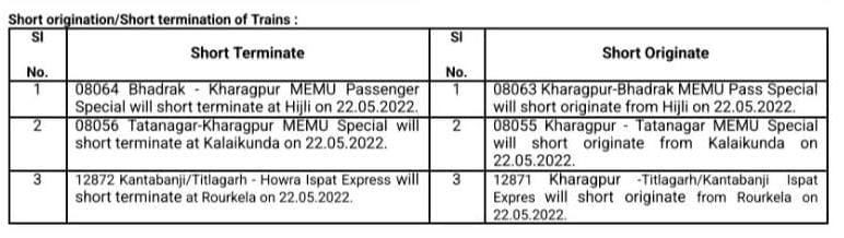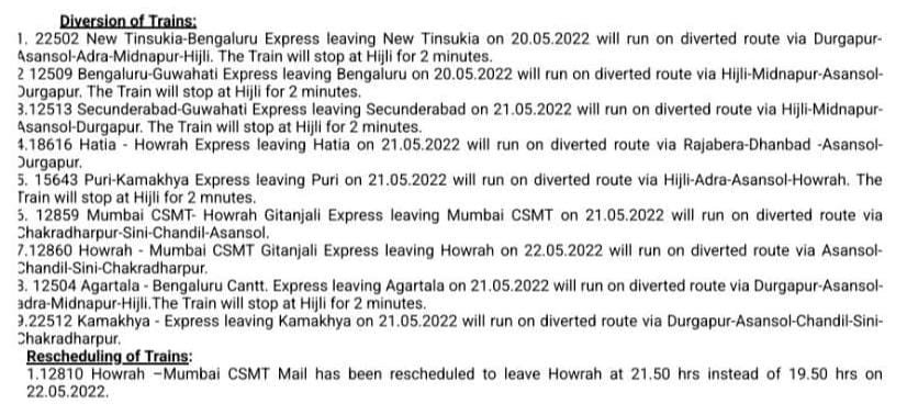 5: 15643 पुरी कामाख्या एक्स्प्रेस जो दिनांक 21 मई को पुरी से चलेगी, अपने नियमित मार्ग की बजाय हिजली, आद्रा, आसनसोल हावड़ा होकर चलेगी। उक्त गाड़ी को हिजली स्टेशन पर 2 मिनट का ठहराव दिया गया है।