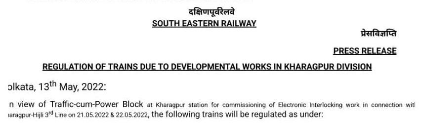 दक्षिण पूर्व रेलवे में दिनांक 21 और 22 मई को खड़गपुर – हिजली खण्ड पर रेल लाईन तिहरी करण हेतु यातायात ब्लॉक घोषित किया गया है। यात्रीगण से निवेदन है, उक्त मार्ग की गाड़ियोंसे रेल यात्रा का नियोजन निम्नलिखित परिपत्रक देख कर करें। पूछताछ हेतु रेल हेल्पलाइन 139, वेबसाइट एवं ऐप NTES का उपयोग करे।