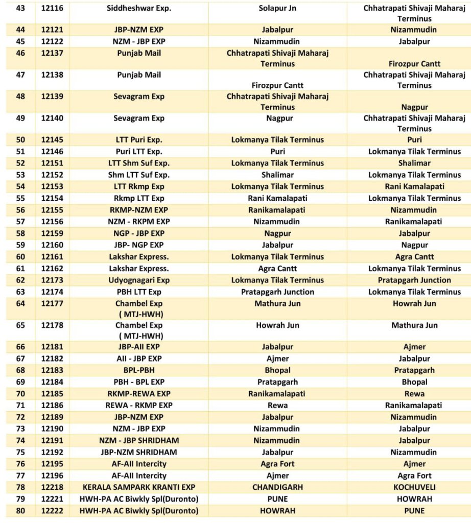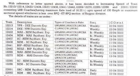 मध्य रेलवे का नागपुर मण्डल का इटारसी – नागपुर – बल्हारशहा यह रेल मार्ग पर जिसमें 7 जोड़ी अर्थात 14 गाड़ियोंको 130 kmph की गति से चलने के लिए चुना गया है। ज्ञात रहे यह सारी गाड़ियाँ आधुनिक LHB कोच से सुसज्जित की गई है और निम्नलिखित परिपत्रक के अनुसार आज/कल से चलना शुरू दी गई है।