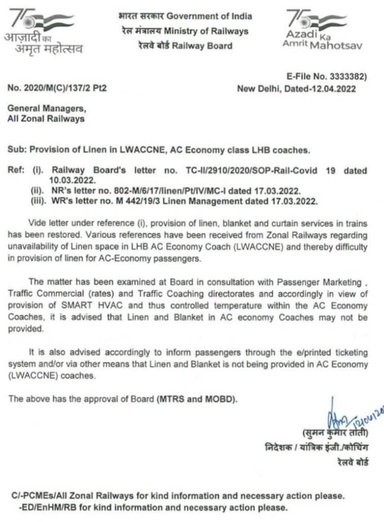 निम्नलिखित परिपत्रक यह कहता है, रेलवे के महत्वकांक्षी नवनिर्मित वातानुकूल थ्री टियर कोच में यात्रिओंको लिनन यानी चद्दरें और कम्बल उपलब्ध नही कराए जाएंगे।