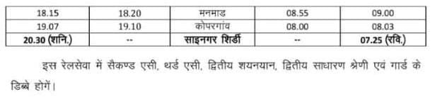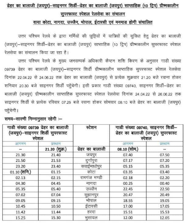 इस विशेष गाड़ी के चलने से पहली बार राजस्थान से शिर्डी के सीधी रेल लिंक स्थापित होने जा रही है। आशा करते है, इस गाड़ी को रेल प्रशासन नियमित कर देवे। गाड़ी की समयसारणी हेतु निम्नलिखित परिपत्रक देखे।