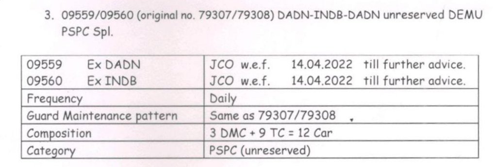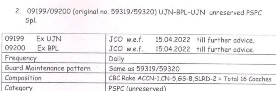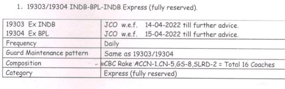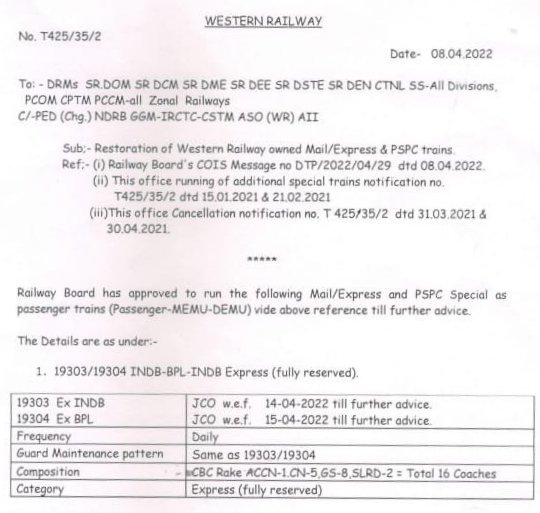 विषय है, पश्चिम रेल्वे की कुछ गाडियाँ पुनरबहाली का। दरअसल पश्चिम रेल्वे ने निम्नलिखित परिपत्रक दिनांक 08 अप्रेल को जारी किया और उसमे पहली ही गाड़ी 19303/04 इन्दौर भोपाल इन्दौर एक्स्प्रेस है जो दिनांक 14 अप्रेल से इन्दौर से और दिनांक 15 अप्रेल से भोपाल से शुरू हो जाएगी। अब दिक्कत यह है, रेल प्रशासन ने इस गाड़ी को ‘फुल्ली रिजर्व्ड’ अर्थात सम्पूर्ण आरक्षित रहेगी ऐसा फरमान दिया है।