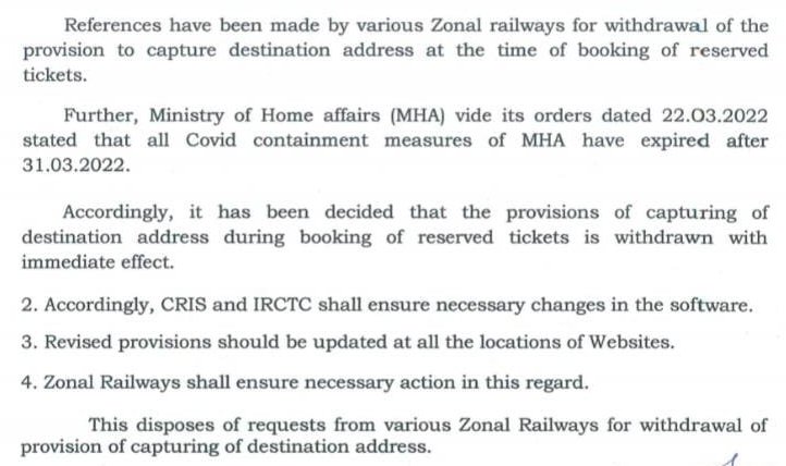 संक्रमण काल मे रेल यात्रा करने में बड़े निर्बंध लगाए गए थे। सारी यात्री गाड़ियाँ आरक्षित और आरक्षण फॉर्म में भी यात्री को अपने गंतव्य रेलवे स्टेशन के साथ वह कहाँ उतरने वाला है, अर्थात उसके गन्तव्य का पता लिखना भी अनिवार्य था।चूँकि 31 मार्च से इन निर्बन्धों मे काफी छूट दी गयी है, अतः रेल प्रशासन ने आरक्षण मांग पत्र से गन्तव्य का पता लिखने की अनिवार्यता को बन्द करने का निर्णय लिया है। इस सबन्धी जारी पत्र में रेल्वे के सारे PRS एवं IRCTC रेलवे की ई-टिकट सेवा को गन्तव्य स्टेशन का यात्री के उतरने, ठहरने का पता लिखने के कॉलम हटाने को कहा गया है।