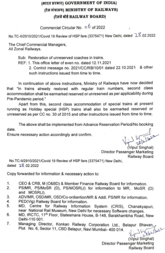 इसके उपरान्त रेल्वे बोर्ड ने इन पुनर्स्थापित किए जानेवाली गाड़ियों के बारे मे एक अलग से पत्र जिसे यहाँ संलग्न कर रहे है, पत्र क्र CC/06 of 2022 दिनांक 28 फरवरी 2022 को जारी कर यह आदेश दिया था “जो भी गाड़ीया अपने पुराने गाड़ी क्रमांक से पुनर्स्थापित की जाएगी, उनमे द्वितीय श्रेणी अनारक्षित आसनों को संक्रमनपूर्व अवस्था मे ही बहाल किया जाएगा।” अब यह अलगसे कहने की जरूरत नहीं की यह पश्चिम रेल प्रशासन की क्षेत्र के यात्रीओं के साथ सरासर ज्यादती है। जब यह गाड़ी पुनर्स्थापित की जा रही है तो उसे सम्पूर्ण आरक्षित क्यों किया जा रहा है?