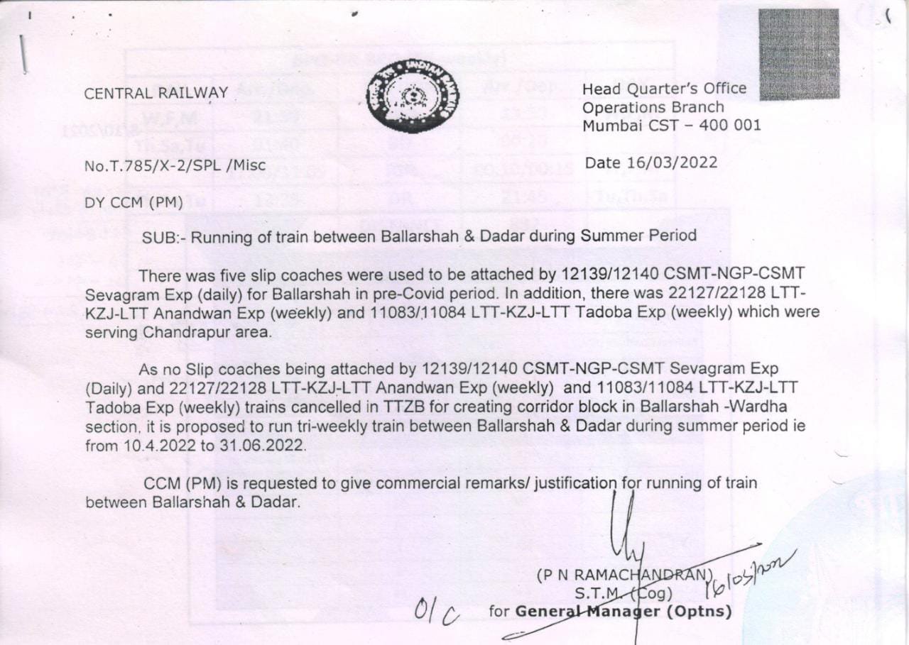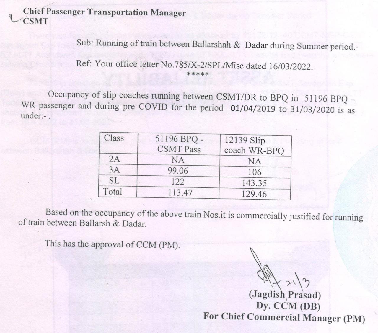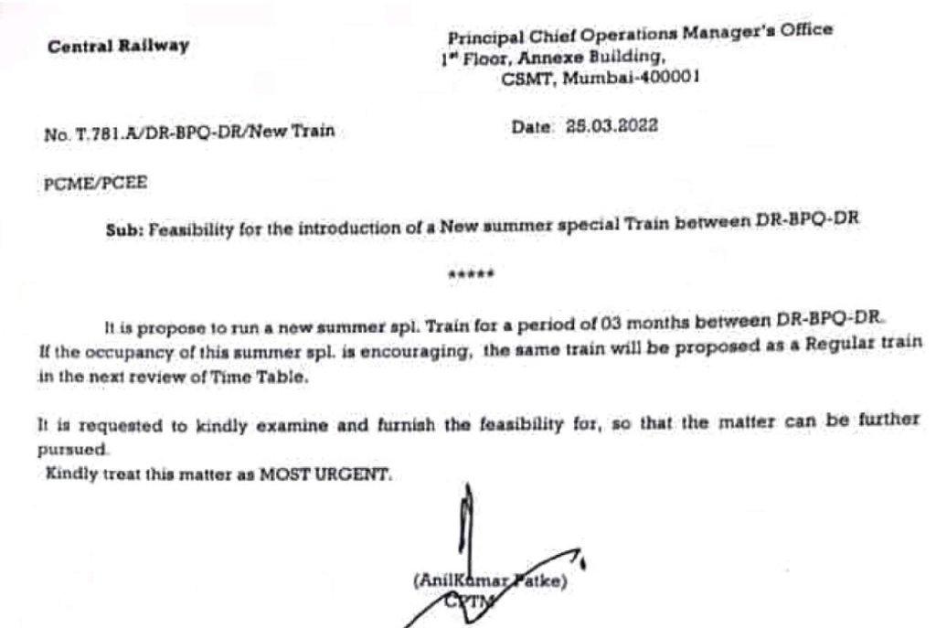ही बाब रेल्वे अधिकारी म्हणा वा जनप्रतिनिधि म्हणा यांच्या लक्षात आली व त्यानी दादर ते बल्हारशहा अशी चंद्रपूरला मुम्बईशी सरळ जोडणारी आठवड्यातुन दोन दिवस चालेल अश्या एक सुट्टी विशेष गाड़ीची योजना तयार केली. ही गाड़ी जर प्रवासीच्या पसंतीस उतरली तर तिला कायम सुरू ठेवण्याचे ही प्रयोजन विचाराधीन होते. ही दादर बल्हारशहा द्विसाप्ताहिक विशेष गाड़ी 10 एप्रिल पासून दाखल होणार होती. पण शेवटी काय तर ते गाजरच ठरले आणि गाड़ी कुठे हरवली ही काही कळलेच नाही.