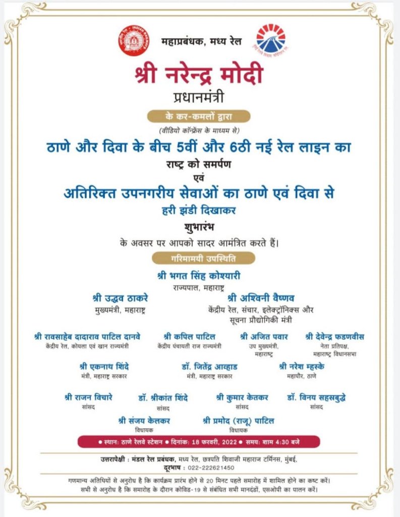 कल छत्रपति शिवाजी महाराज की जन्मजयंती है। सबसे पहले मैं भारत के गौरव, भारत की पहचान और संस्कृति के रक्षक देश के महान महानायक के चरणों में आदरपूर्वक प्रणाम करता हूँ। शिवाजी महाराज की जयंती के एक दिन पहले ठाणे-दिवा के बीच नई बनी पांचवीं और छठी रेल लाइन के शुभारंभ पर हर मुंबईकर को बहुत-बहुत बधाई।