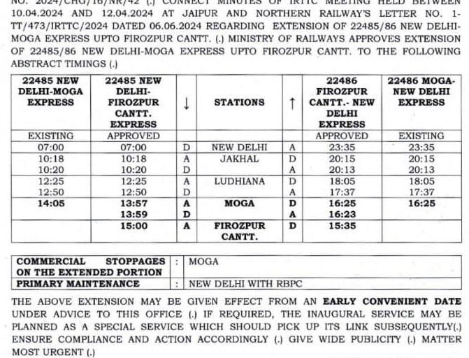 इस विभाग में एक और विकास की सूचना है। 22485/86 नई दिल्ली मोगा नई दिल्ली इन्टरसिटी एक्सप्रेस का फिरोजपुर कैंट तक विस्तार किया जा रहा है। निम्नलिखित परिपत्र देखिए,