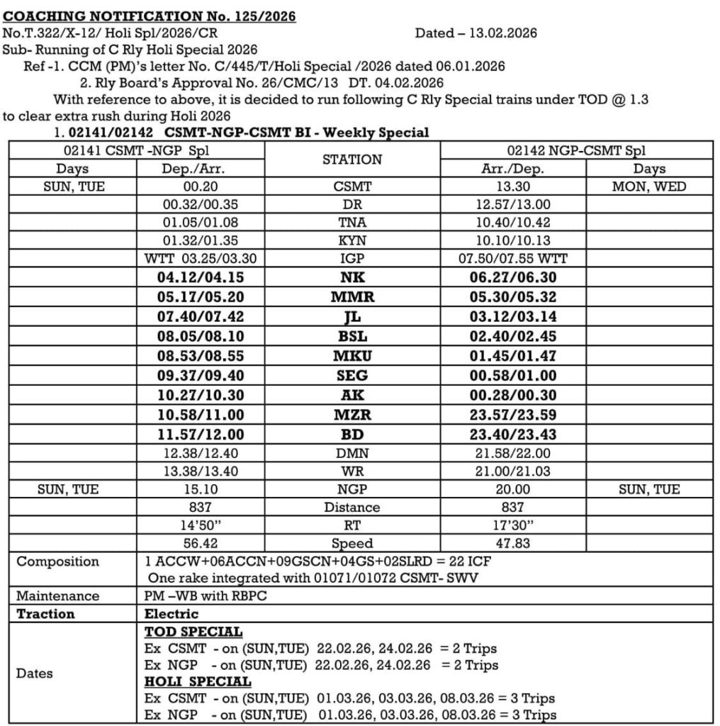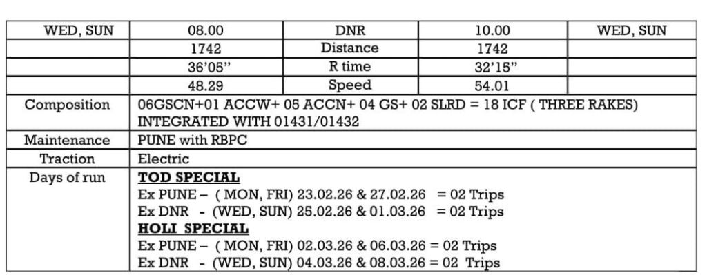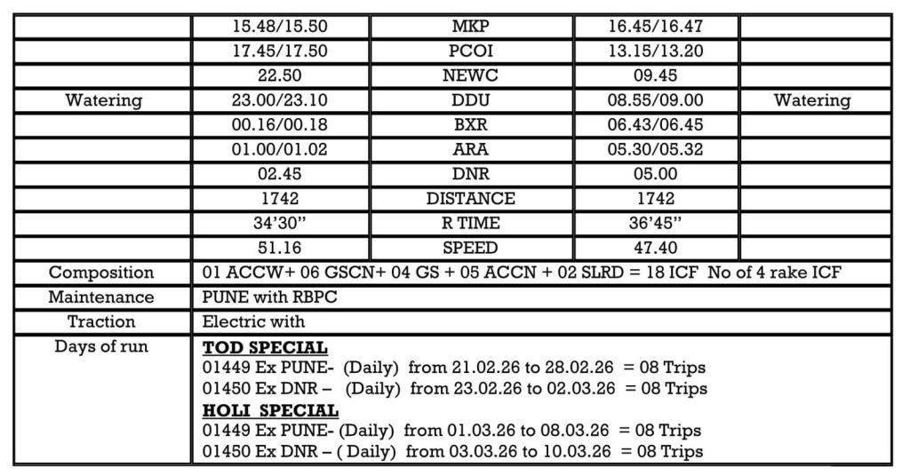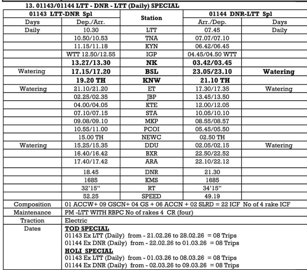 เคฏเฅ‡ เคŸเฅเคฐเฅ‡เคจเฅ‡เค‚ เคฆเคฟเคจเคพเค‚เค• 21.02.2026 เคธเฅ‡ 02.03.2026 เคคเค• เคตเคฟเคถเฅ‡เคท เคŸเฅเคฐเฅ‡เคจเฅ‹เค‚ เค•เฅ‡ เคฐเฅ‚เคช เคฎเฅ‡เค‚ (16 เคธเฅ‡เคตเคพเคเค‚) เค”เคฐ เคฆเคฟเคจเคพเค‚เค• 01.03.2026 เคธเฅ‡ 10.03.2026 เคคเค• เคนเฅ‹เคฒเฅ€ เคตเคฟเคถเฅ‡เคท เคŸเฅเคฐเฅ‡เคจเฅ‹เค‚ เค•เฅ‡ เคฐเฅ‚เคช เคฎเฅ‡เค‚ (16 เคธเฅ‡เคตเคพเคเค‚) เคšเคฒเฅ‡เค‚เค—เฅ€เฅค