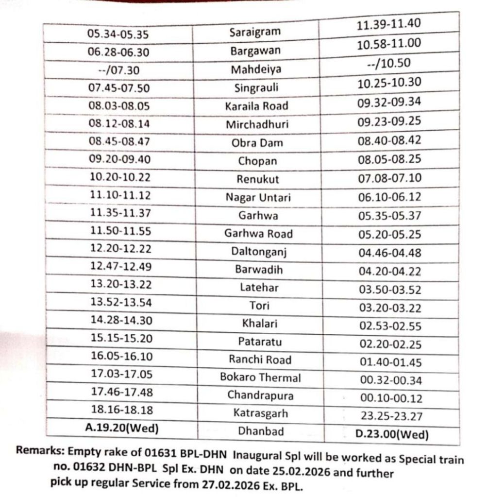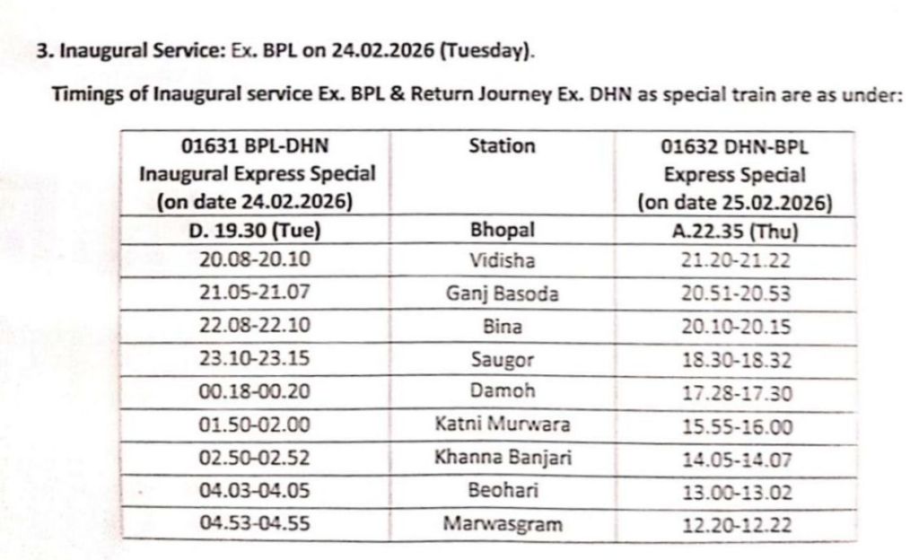 01631 เคญเฅ‹เคชเคพเคฒ เคงเคจเคฌเคพเคฆ เคถเฅเคญเคพเคฐเค‚เคญ เคตเคฟเคถเฅ‡เคท เคฆเคฟเคจเคพเค‚เค• 24 เคซเคฐเคตเคฐเฅ€ เค•เฅ‹ เคญเฅ‹เคชเคพเคฒ เคธเฅ‡ เคถเคพเคฎ 19:30 เค•เฅ‹ เคฐเคตเคพเคจเคพ เคนเฅ‹เค—เฅ€ เค”เคฐ เคตเคพเคชเคธเฅ€ เคฎเฅ‡เค‚ 01632 เคงเคจเคฌเคพเคฆ เคญเฅ‹เคชเคพเคฒ เคถเฅเคญเคพเคฐเค‚เคญ เคตเคฟเคถเฅ‡เคท เคฆเคฟเคจเคพเค‚เค• 25 เคซเคฐเคตเคฐเฅ€ เค•เฅ‹ เคฐเคพเคค 23:00 เคฌเคœเฅ‡ เคฐเคตเคพเคจเคพ เคนเฅ‹เค—เฅ€เฅค