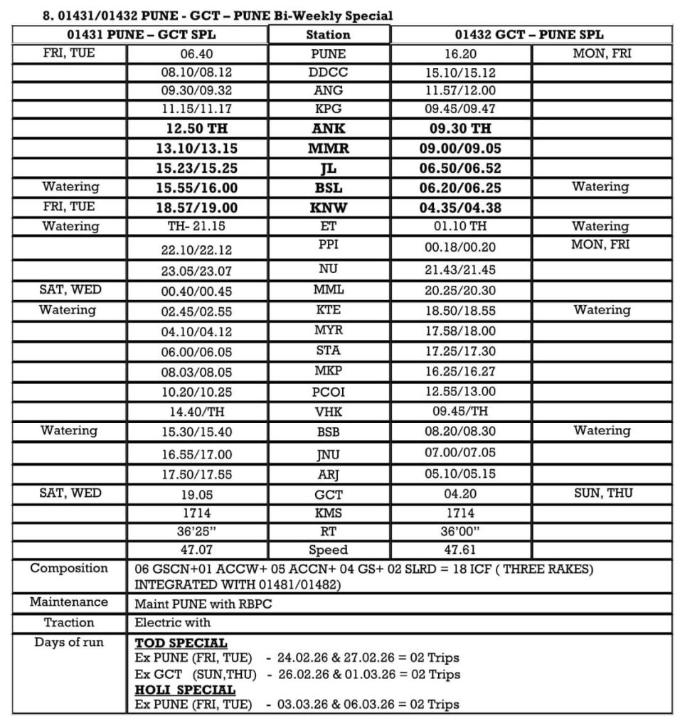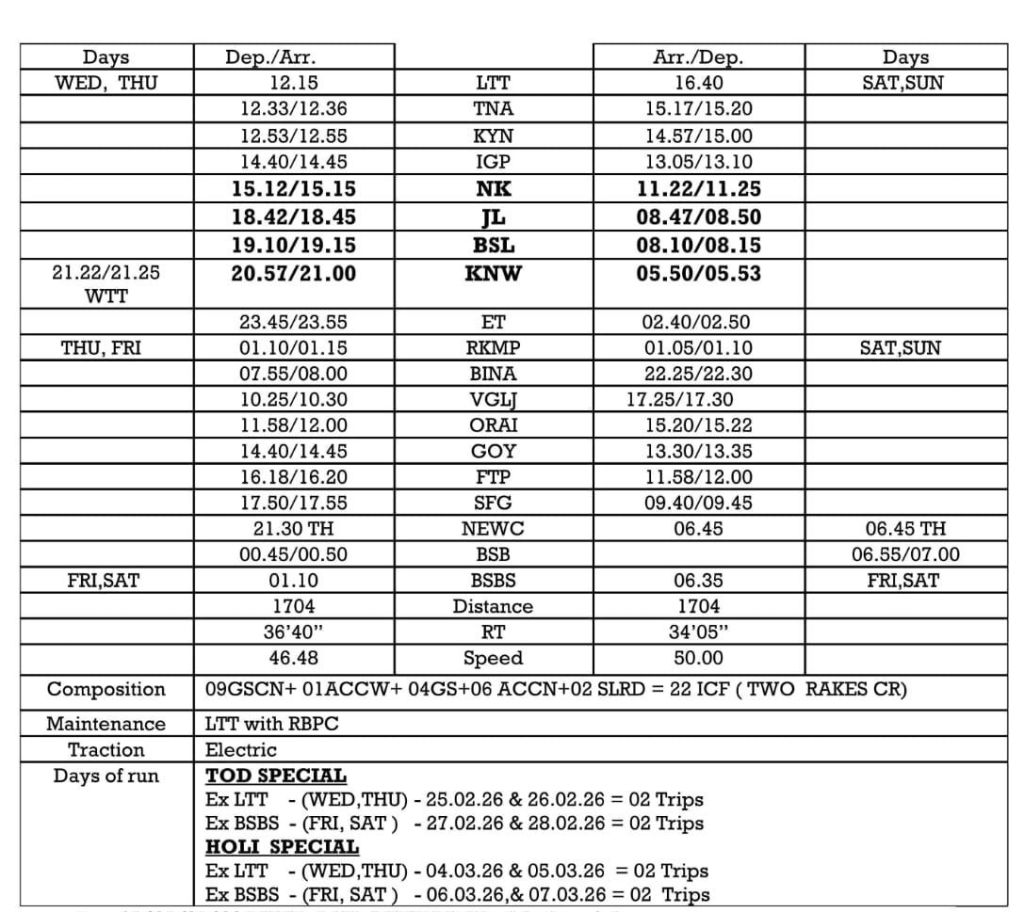 เคฏเฅ‡ เคŸเฅเคฐเฅ‡เคจเฅ‡เค‚ เคฆเคฟเคจเคพเค‚เค• 22.02.2026 เค”เคฐ เคฆเคฟเคจเคพเค‚เค• 24.02.2026 เค•เฅ‹ เคตเคฟเคถเฅ‡เคท เคŸเฅเคฐเฅ‡เคจเฅ‹เค‚ เค•เฅ‡ เคฐเฅ‚เคช เคฎเฅ‡เค‚ (4 เคธเฅ‡เคตเคพเคเค‚) เค”เคฐ เคฆเคฟเคจเคพเค‚เค• 01.03.2026, 03.03.2026 เค”เคฐ 08.03.2026 เค•เฅ‹ เคนเฅ‹เคฒเฅ€ เคตเคฟเคถเฅ‡เคท เคŸเฅเคฐเฅ‡เคจเฅ‹เค‚ เค•เฅ‡ เคฐเฅ‚เคช เคฎเฅ‡เค‚ (6 เคธเฅ‡เคตเคพเคเค‚) เคšเคฒเฅ‡เค‚เค—เฅ€เฅค