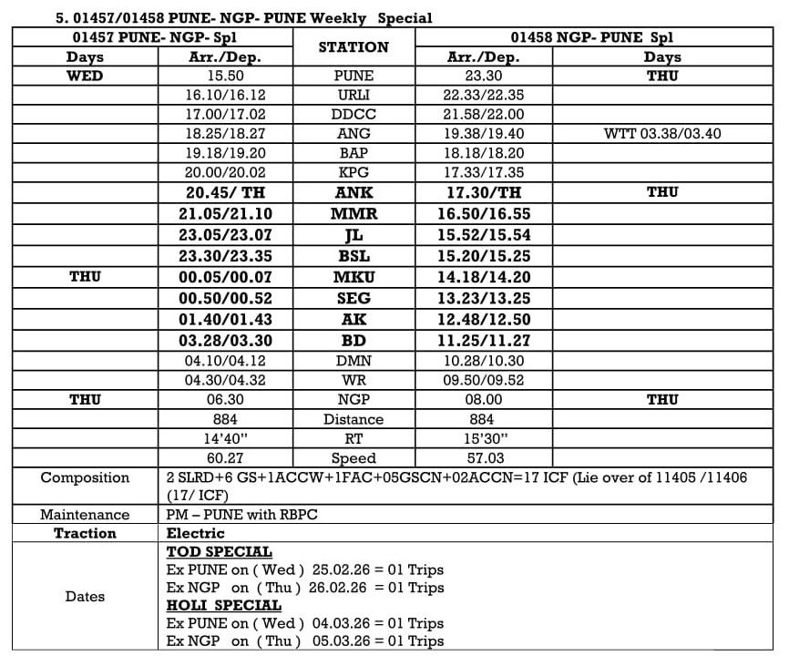 เคŸเฅเคฐเฅ‡เคจ เคธเค‚เค–เฅเคฏเคพ 01458 เคธเคพเคชเฅเคคเคพเคนเคฟเค• เคตเคฟเคถเฅ‡เคท เคŸเฅเคฐเฅ‡เคจ เคชเฅเคฐเคคเฅเคฏเฅ‡เค• เค—เฅเคฐเฅเคตเคพเคฐ เค•เฅ‹ เคฆเคฟเคจเคพเค‚เค• 26.02.2026 เค”เคฐ 05.03.2026 เค•เฅ‹ เคจเคพเค—เคชเฅเคฐ เคธเฅ‡ 08:00 เคฌเคœเฅ‡ เคชเฅเคฐเคธเฅเคฅเคพเคจ เค•เคฐเฅ‡เค—เฅ€ เค”เคฐ เค‰เคธเฅ€ เคฆเคฟเคจ 23:30 เคฌเคœเฅ‡ เคชเฅเคฃเฅ‡ เคชเคนเฅเค‚เคšเฅ‡เค—เฅ€เฅค