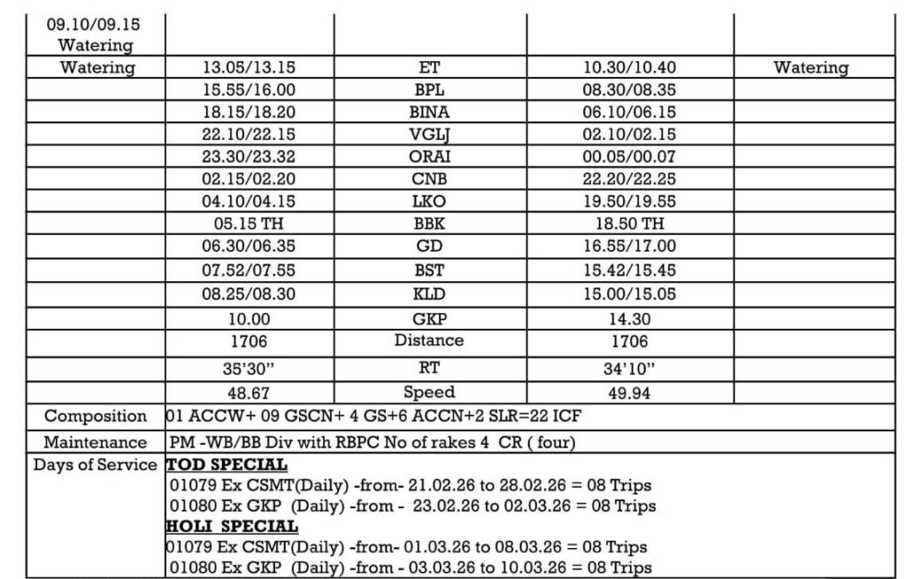 เคŸเฅเคฐเฅ‡เคจ เคธเค‚เค–เฅเคฏเคพ 01079 เคฆเฅˆเคจเคฟเค• เคตเคฟเคถเฅ‡เคท เคŸเฅเคฐเฅ‡เคจ เคฆเคฟเคจเคพเค‚เค• 21.02.2026 เคธเฅ‡ 08.03.2026 เคธเฅ‡ เคชเฅเคฐเคคเคฟเคฆเคฟเคจ เคธเฅ€เคเคธเคเคฎเคŸเฅ€ เคธเฅ‡ เคฐเคพเคค 22:30 เคฌเคœเฅ‡ เคชเฅเคฐเคธเฅเคฅเคพเคจ เค•เคฐเฅ‡เค—เฅ€ เค”เคฐ เคคเฅ€เคธเคฐเฅ‡ เคฆเคฟเคจ เคธเฅเคฌเคน 10:00 เคฌเคœเฅ‡ เค—เฅ‹เคฐเค–เคชเฅเคฐ เคชเคนเฅเค‚เคšเฅ‡เค—เฅ€เฅค