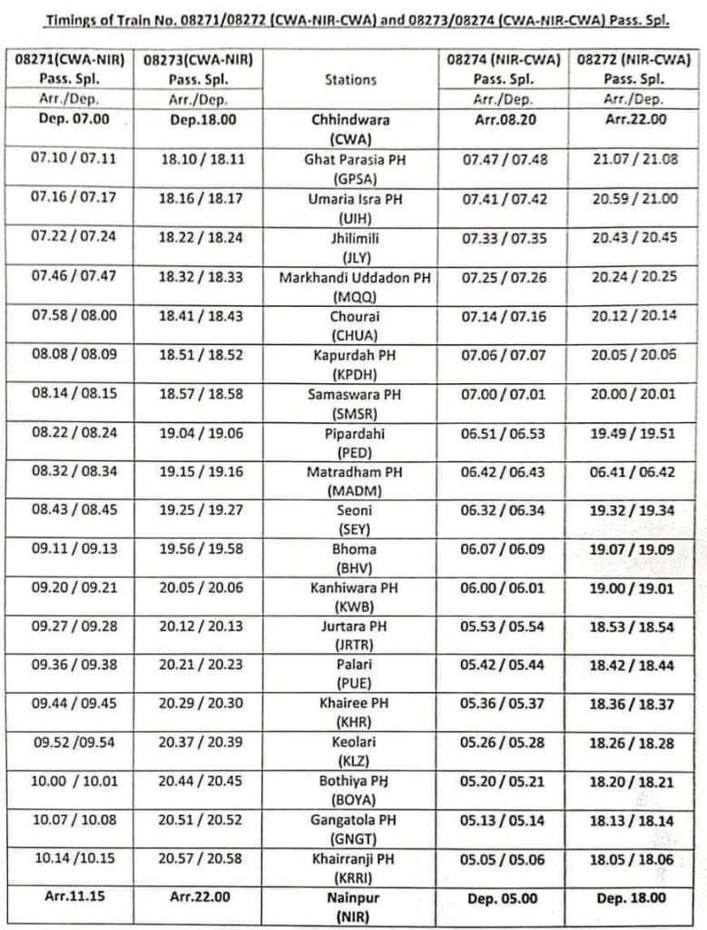 इसके साथ ही छिंदवाड़ा – नैनपुर के बीच दो जोड़ी सवारी विशेष गाड़ियाँ भी यात्री सेवाओं में दाखिल हो रही है। जिसकी समयसारणी एवं किराया तालिका उपलब्ध करा रहे है। चूँकि गाड़ियाँ अभी भी विशेष श्रेणी में चलाई जा रही है अतः इनके किराए मेल/एक्सप्रेस की द्वितीय श्रेणी से ही चुकाने होंगे।