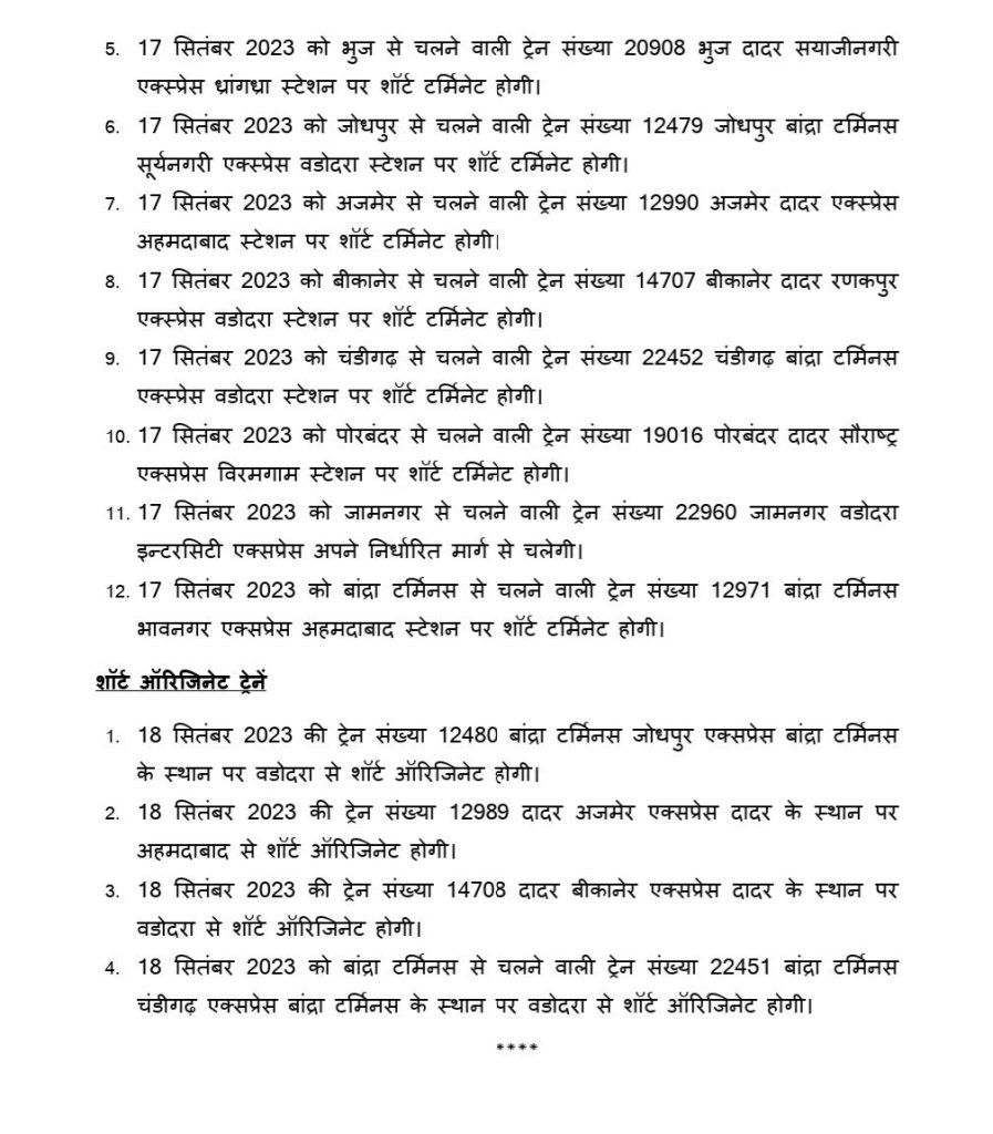 निम्नलिखित दस जोड़ी गाड़ियाँ अब अहमदाबाद स्टेशन पर टर्मिनेट/ऑरिजिनेट होने की जगह साबरमती या गांधीनगर कैपिटल स्टेशन से रवाना या खत्म होगी। जाहिर सी बात है, यात्रिओंको जो जंक्शन सुविधा का उपयोग करते है, किसी अन्य स्टेशन से आकर अहमदाबाद में गाड़ी बदलकर अपनी आगे की रेल यात्रा शुरू करते थे, बहुत असुविधा होने वाली है। यात्रीगण कृपया परिपत्रक में टर्मिनल बदलाव की तिथि पर ध्यान दीजिएगा।