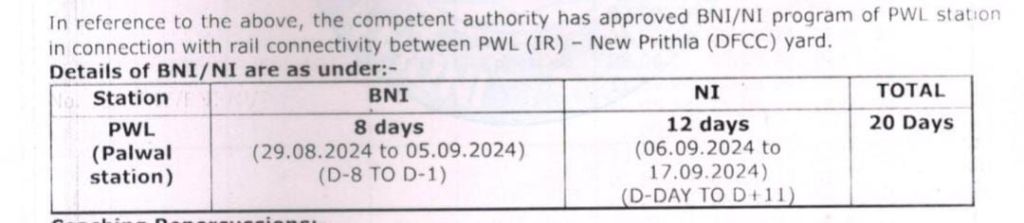 उत्तर रेलवे में मथुरा – नई दिल्ली खण्ड पर स्थित पलवल स्टेशन यार्ड रिमॉडलिंग हेतु दिनांक 29 अगस्त से 17 सितम्बर 2024 तक, 20 दिनोंका रेल ब्लॉक घोषित किया गया था। इसमे कई यात्री गाड़ियाँ रद्द/आँशिक रद्द/ नियंत्रित एवं परावर्तित मार्ग से चलाई जानी थी।