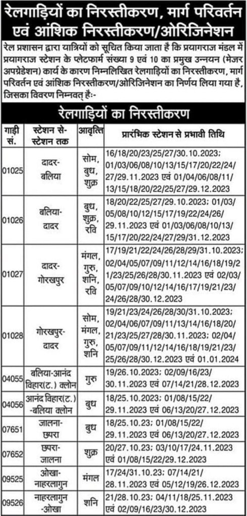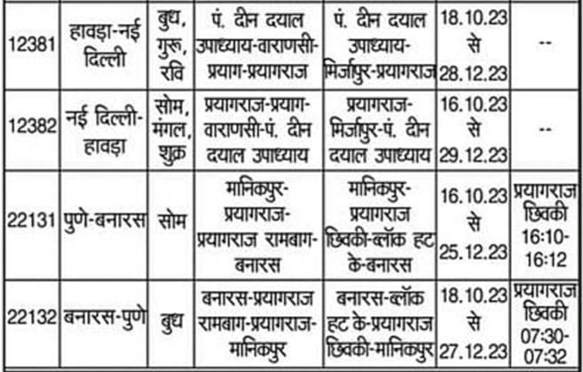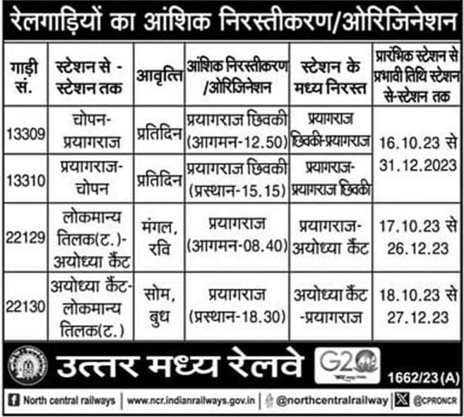 उत्तर मध्य रेल NCR में प्रयागराज जंक्शन रेलवे स्टेशन का पुनर्विकास कार्य शुरू हो रहा है, अतः निम्नलिखित अवधि में गाड़ियोंका परिचालन इस प्रकार से रहेगा।