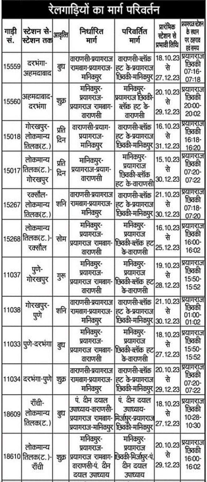 निम्नलिखित गाड़ियोंका मार्ग परिवर्तन किया गया है। यह गाड़ियाँ प्रयागराज जंक्शन की बजाय, प्रयागराज छिंवकी से अपने गंतव्य की ओर प्रस्थान करेंगी।