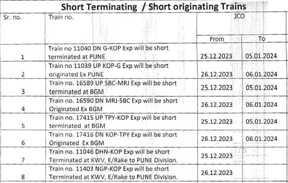 01023/24 पुणे कोल्हापुर पुणे विशेष JCO दिनांक 26 दिसम्बर 2023 से 06 जनवरी 2024 तक रद्द