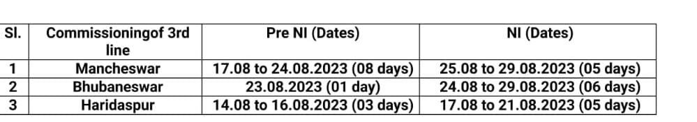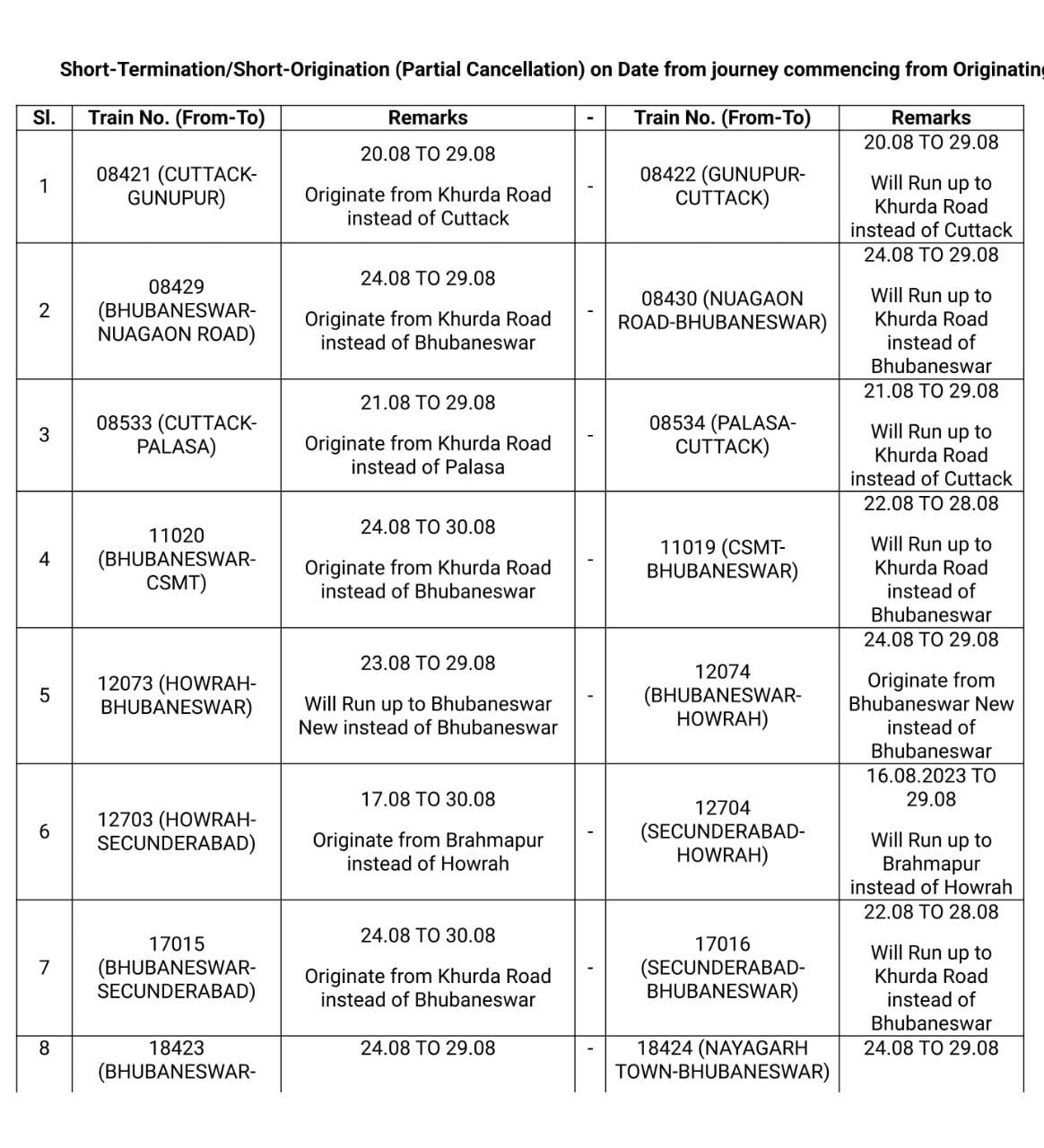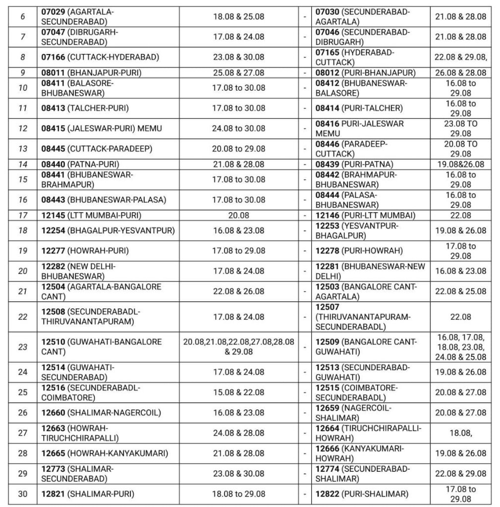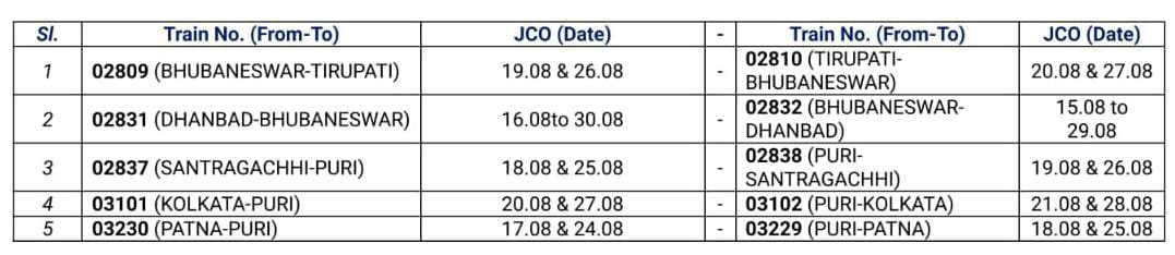 यात्रीगण कृपया ध्यान दीजिए, पूर्वतटीय रेलवे में दिनांक 17 से 30 अगस्त भुबनेश्वर – मन्चेश्वर के बीच रेल तिहरीकरण का कार्य, मन्चेश्वर में यार्ड सुधार कार्य, भुबनेश्वर स्टेशन एवं यार्ड सिग्नलिंग उन्नयन, हरिदासपुर में दिनांक 14 से 21 अगस्त तक सिग्नल सिस्टम का उन्नयन कार्य, सम्बलपुर एवं सम्बलपुर सिटी के बीच रेल इन्फ्रास्ट्रक्चर कार्य। इन कार्योंके चलते 85 जोड़ी यात्री गाड़ियोंको रद्द किया जा रहा है। 11 जोड़ी गाड़ियाँ आँशिक रद्द तो अन्य 04 जोड़ी गाड़ियाँ मार्ग परिवर्तन कर चलेंगी। विस्तृत परिपत्रक निम्नलिखित है,