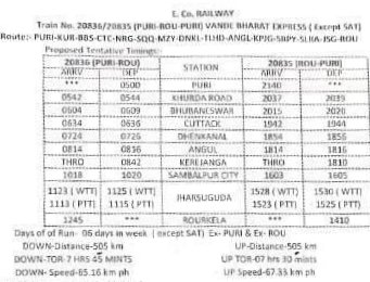 20836/35 पुरी राउरकेला पुरी वन्देभारत एक्सप्रेस सप्ताह में 6 दिन प्रत्येक शनिवार छोड़कर चलाई जाने का प्रस्ताव है।