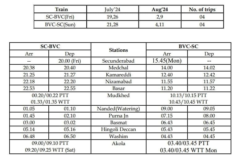 मार्ग में सेवाग्राम, चंद्रपुर, बल्हारशाह, रामागुण्डम एवं काजीपेट स्टेशनोंपर ठहराव लेंगी।