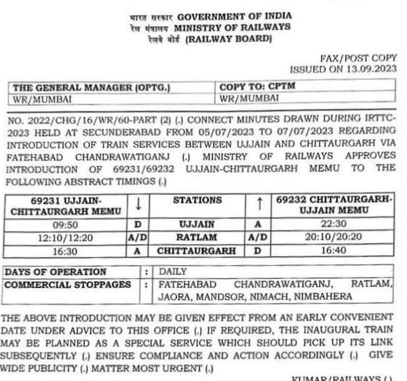 नई प्रस्तावित डॉ आंबेडकर नगर महू – हिसार एक्सप्रेस वाया उज्जैन, सप्ताह में चार दिन, प्रत्येक सोमवार, मंगलवार, गुरुवार एवं शनिवार को चलाई जाएगी और वापसी में हिसार से प्रत्येक मंगलवार, बुधवार, शुक्रवार एवं रविवार को रवाना होगी।