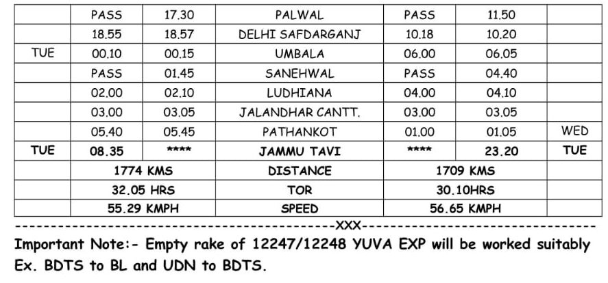 कोच संरचना : 01 वातानुकूल टु टियर, 03 वातानुकूल थ्री टियर, 12 स्लिपर, 04 द्वितीय साधारण, 02 एसएलआर कुल 22 कोच रहेंगे।
