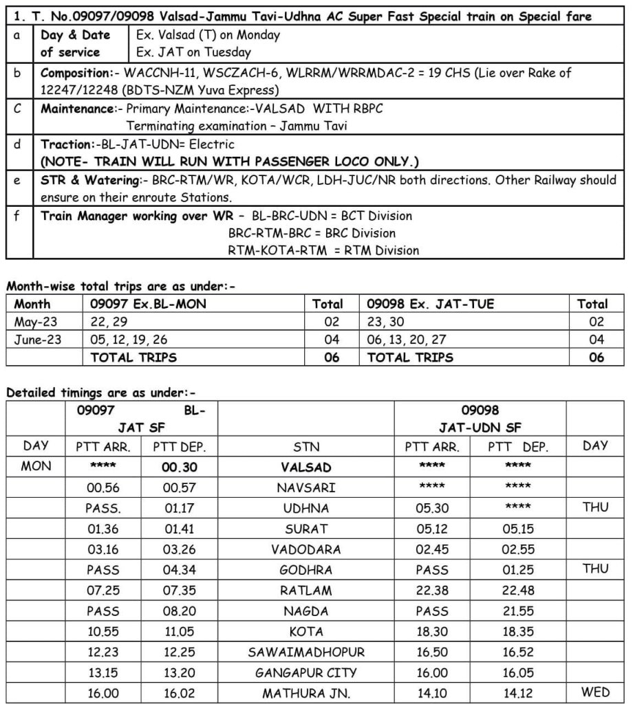 09007 विशेष एक्सप्रेस वलसाड से दिनांक 02 नवम्बर से 28 दिसम्बर तक प्रत्येक गुरुवार को भिवानी के लिए 13:50 को रवाना होगी और वापसी में 09008 विशेष एक्सप्रेस भिवानी से दिनांक 03 नवम्बर से 29 दिसम्बर तक प्रत्येक शुक्रवार को वलसाड़ के लिए, दोपहर 14:45 को रवाना होगी।