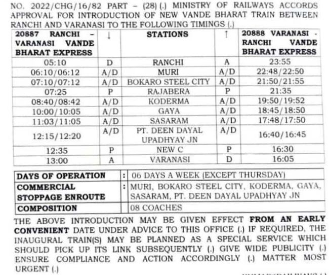 2: 20887/88 राँची वाराणसी राँची वन्देभारत (सप्ताह में छह दिवसीय)